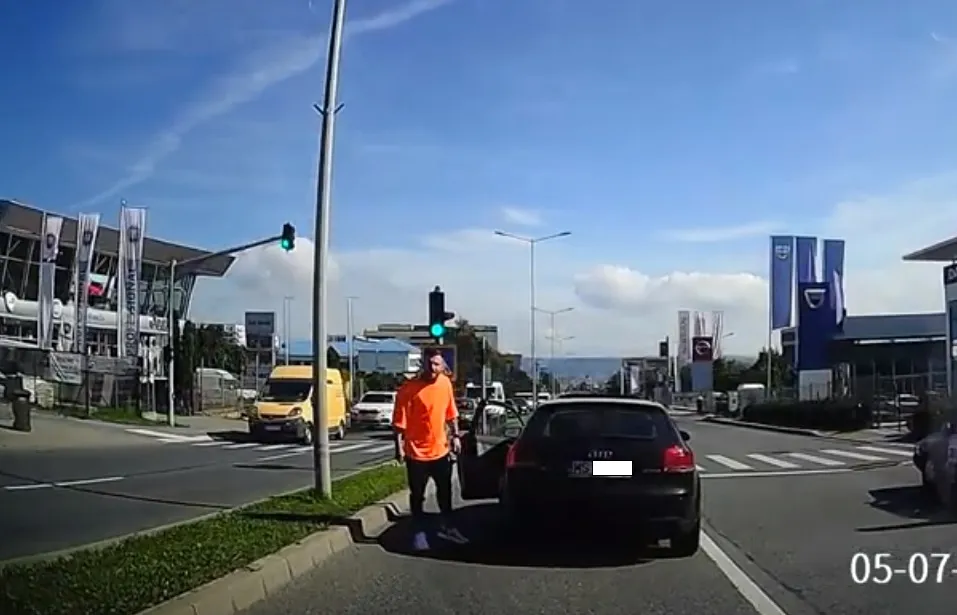 La trecerea de pietoni, fiind roșu, acesta s-a dat jos din mașină pentru a-și face dreptate, dar s-a liniștit după un val de înjurături.