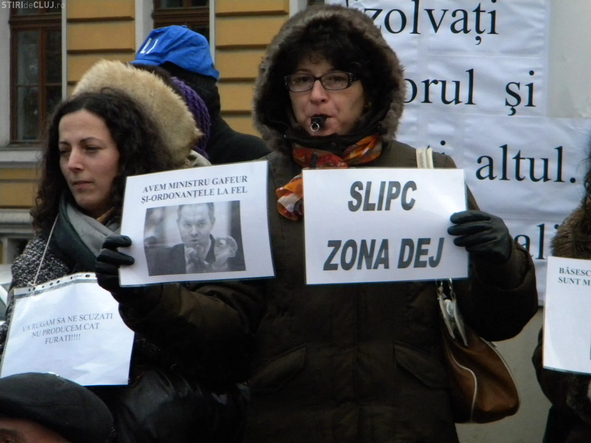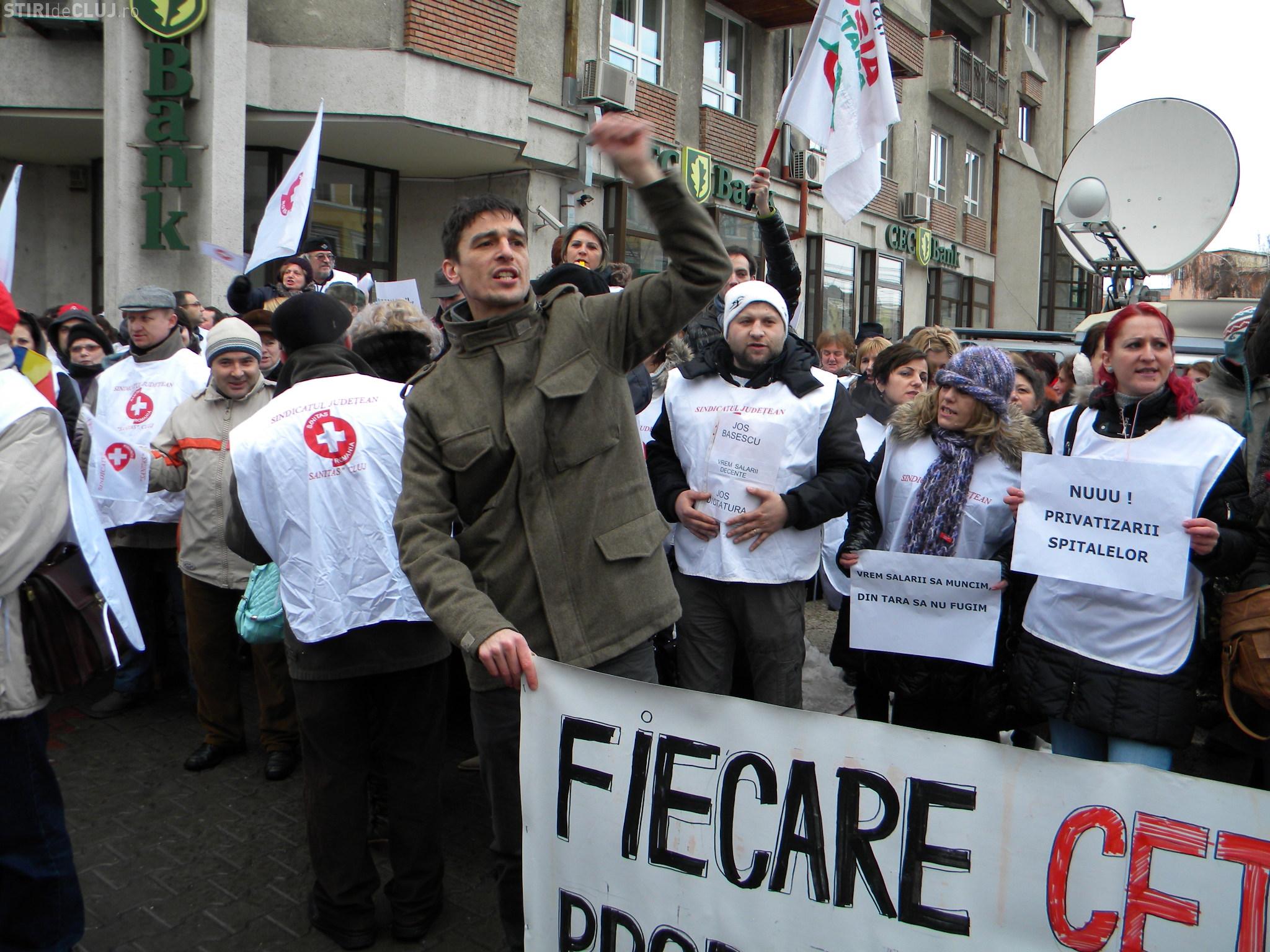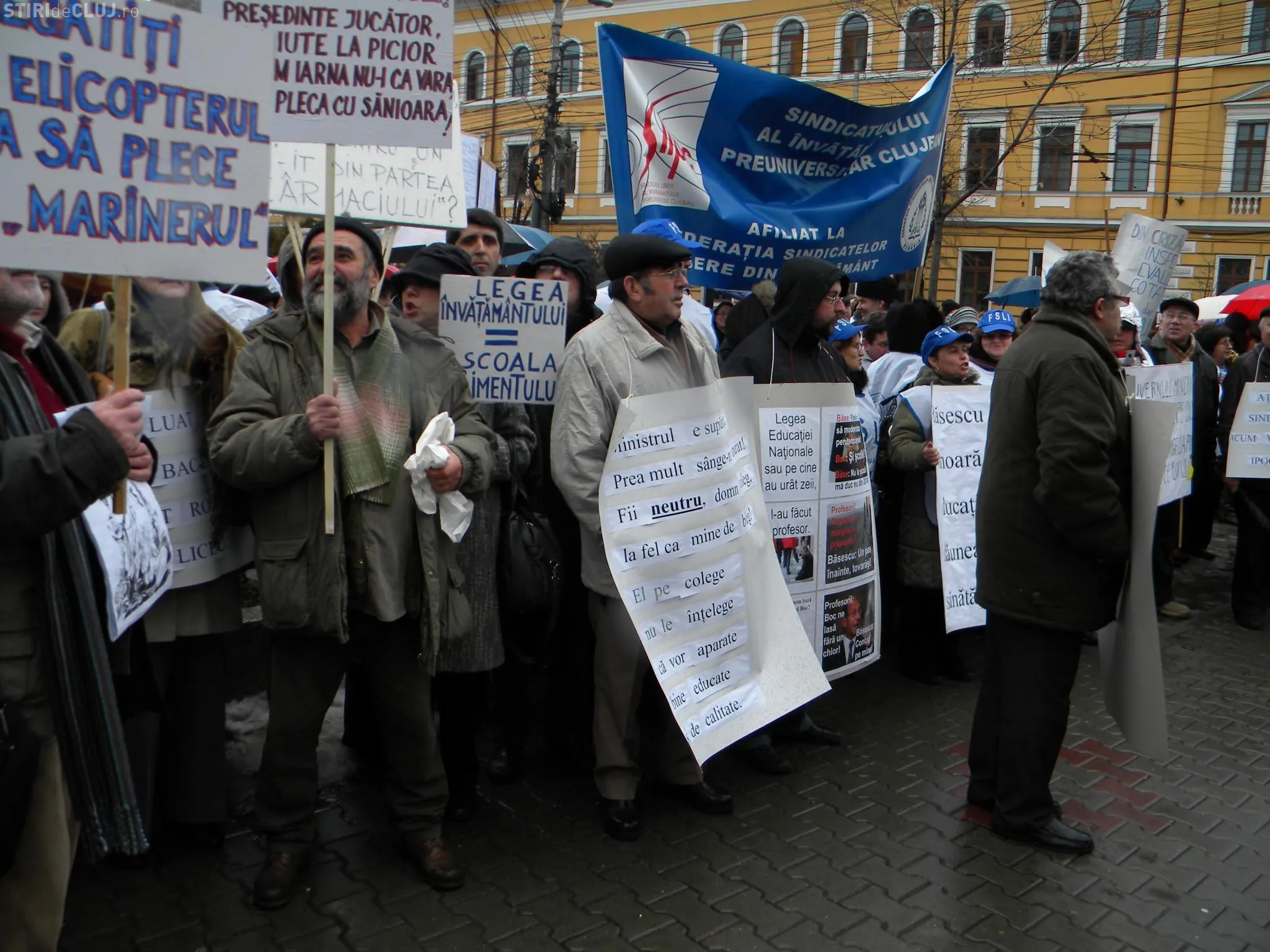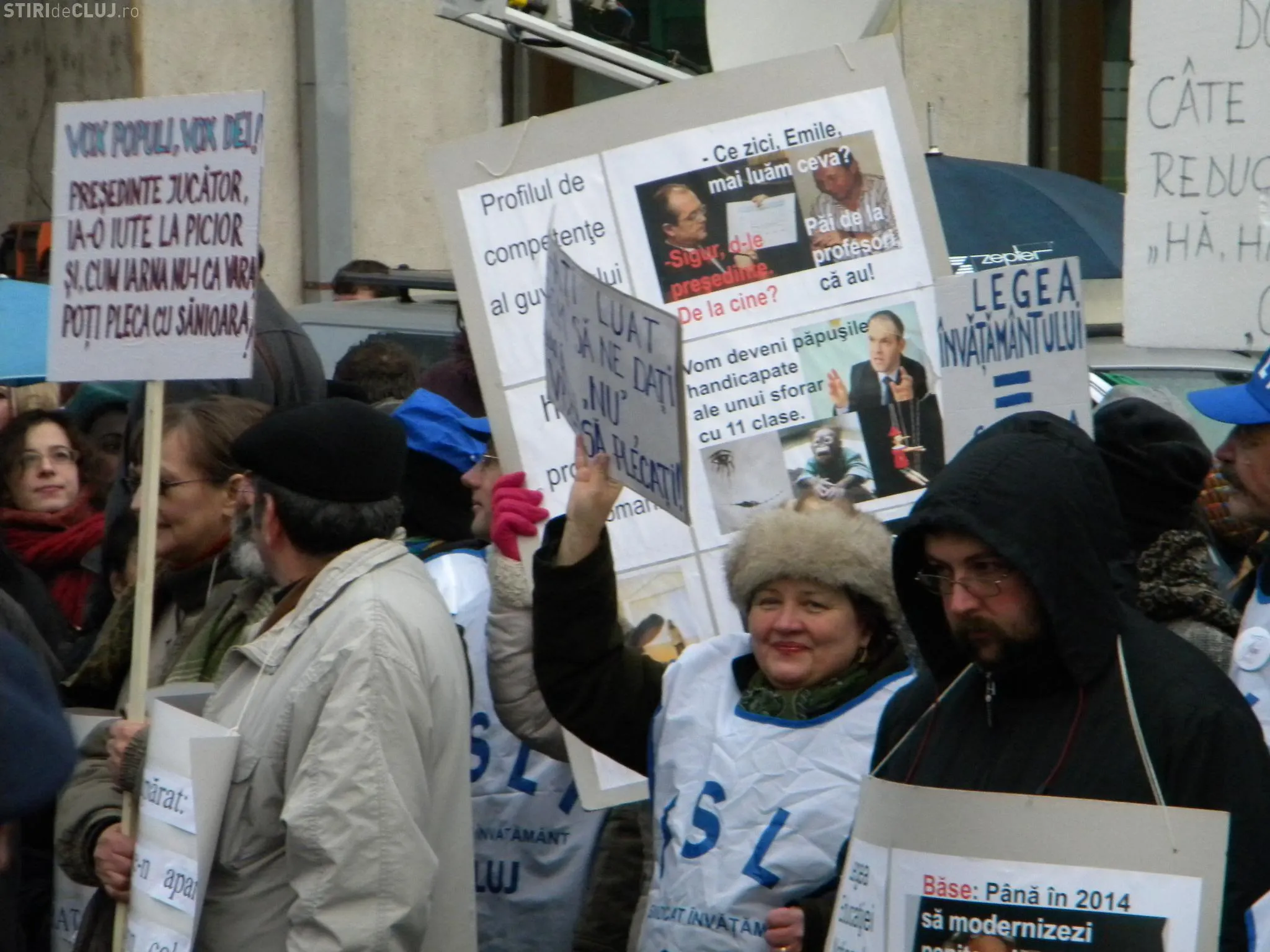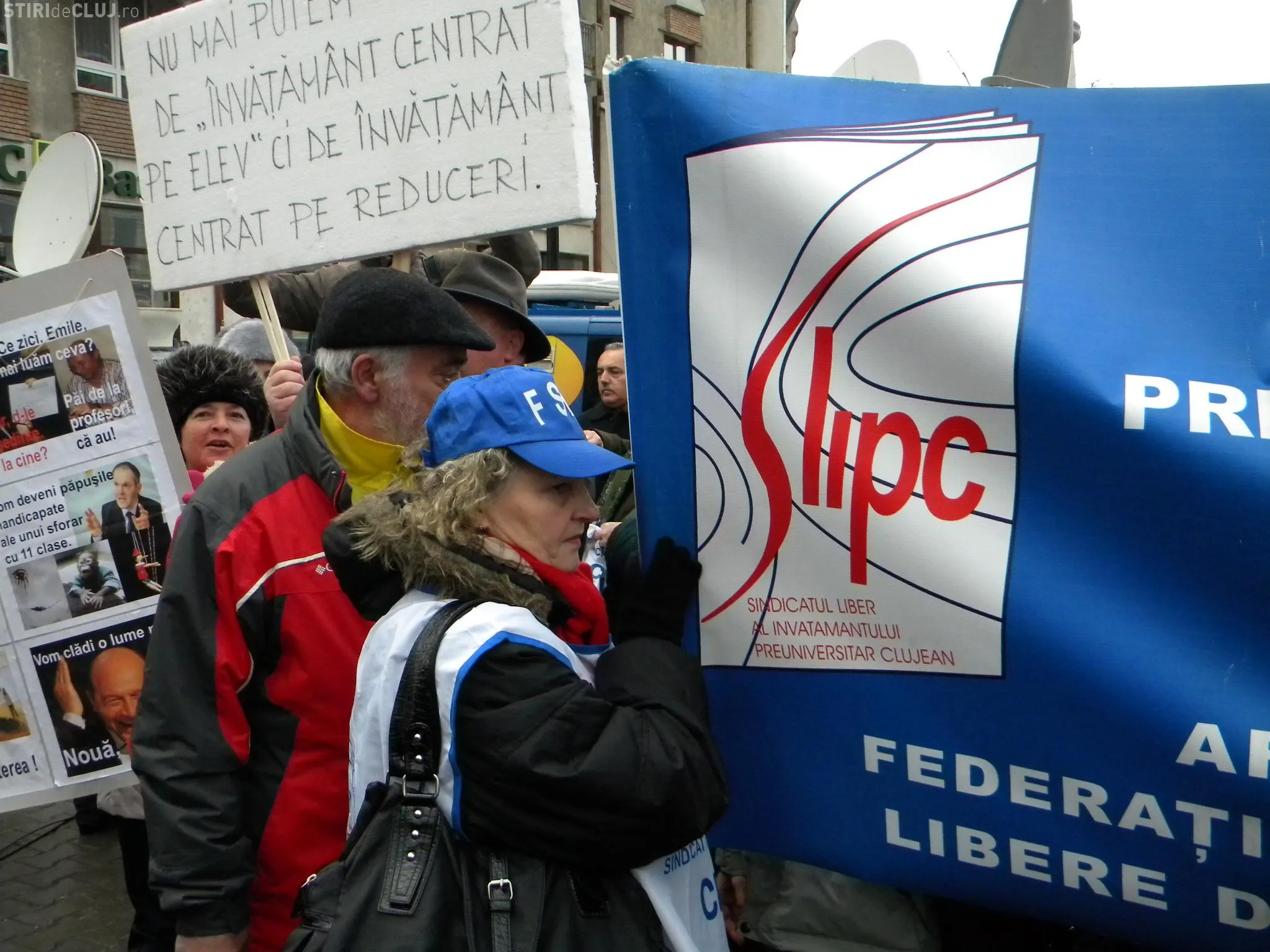 Circa 250 de sindicalisti din educatie si sanatate au protestat in fata Prefecturii Cluj, cerand demisia presedintelui si a guvernului, dar si o serie de revendicari sindicale.