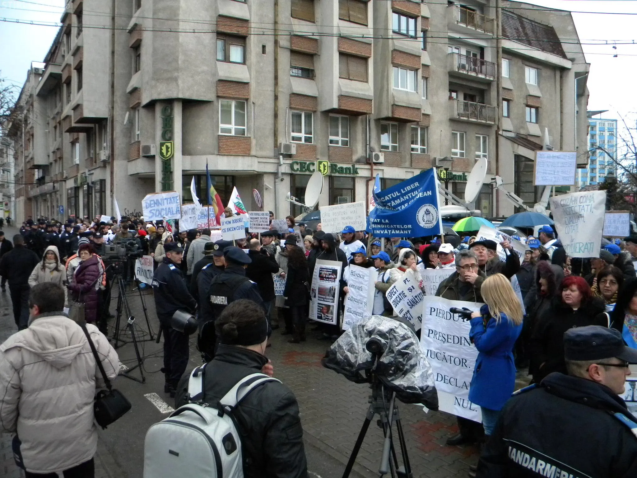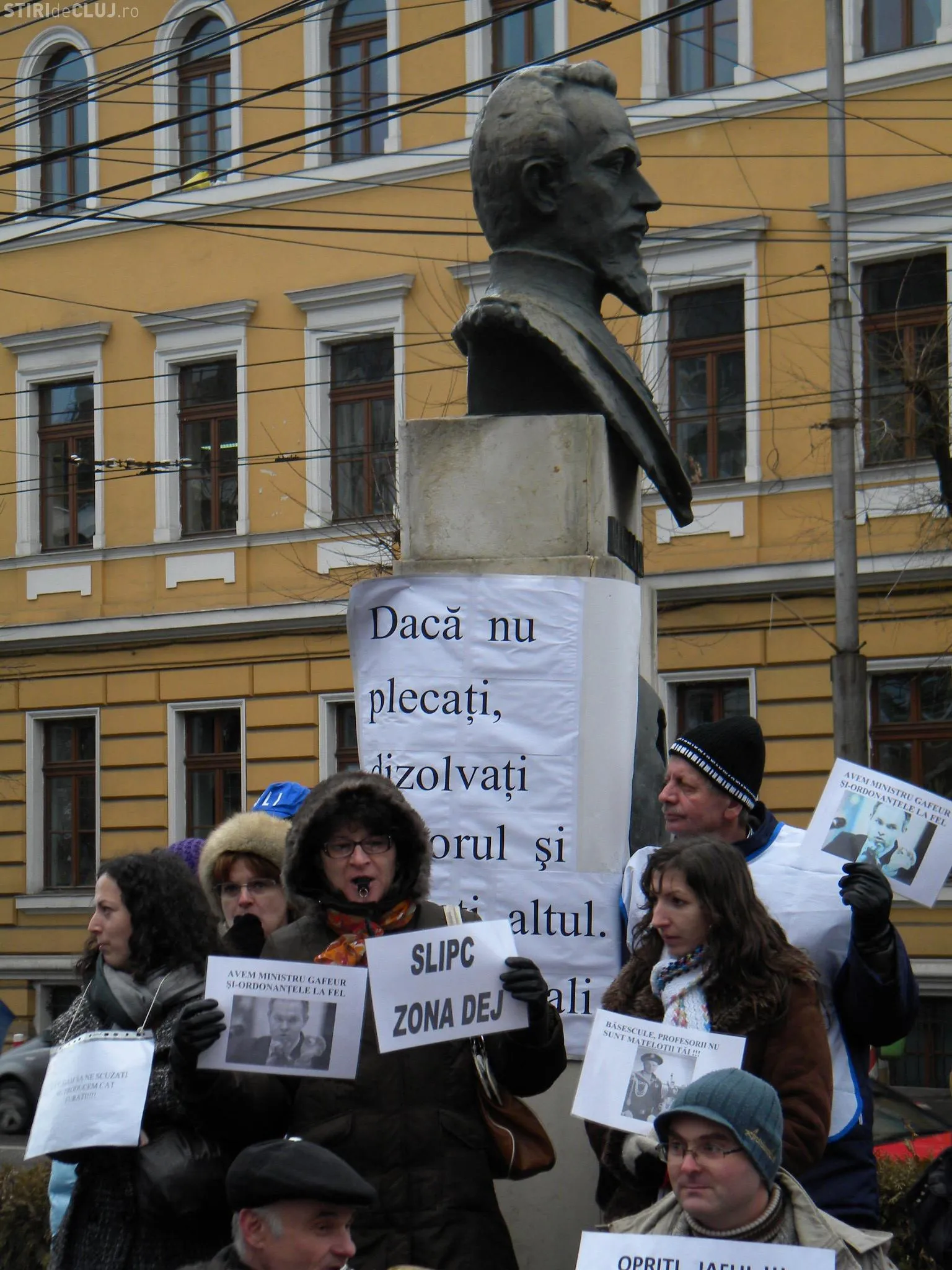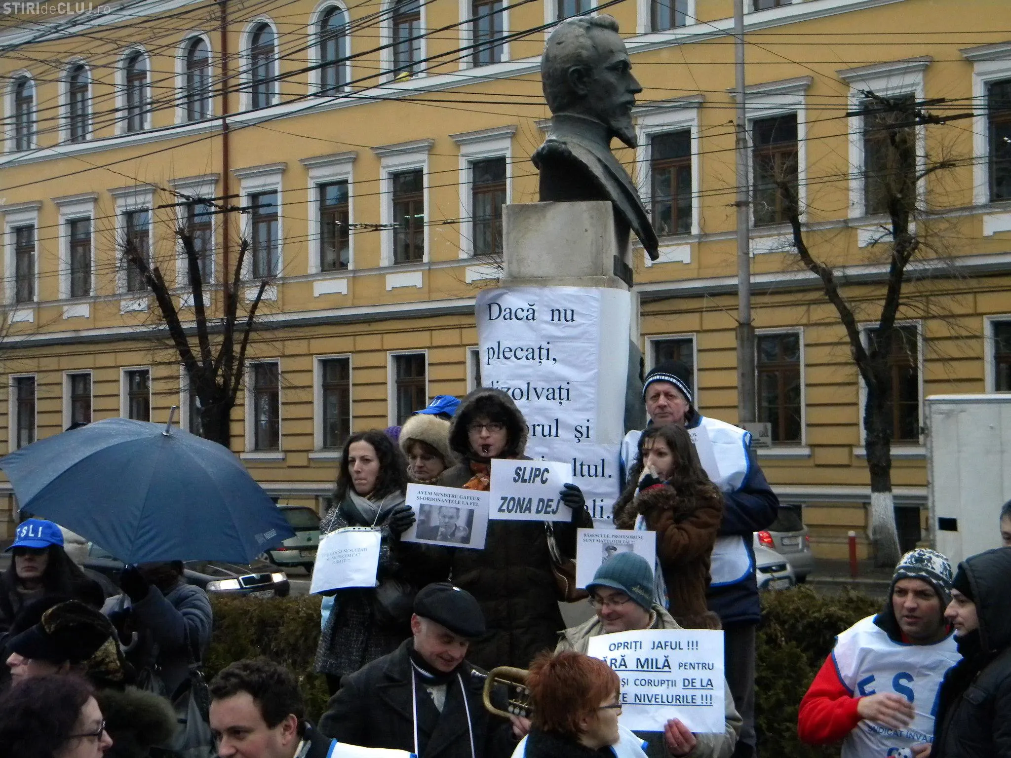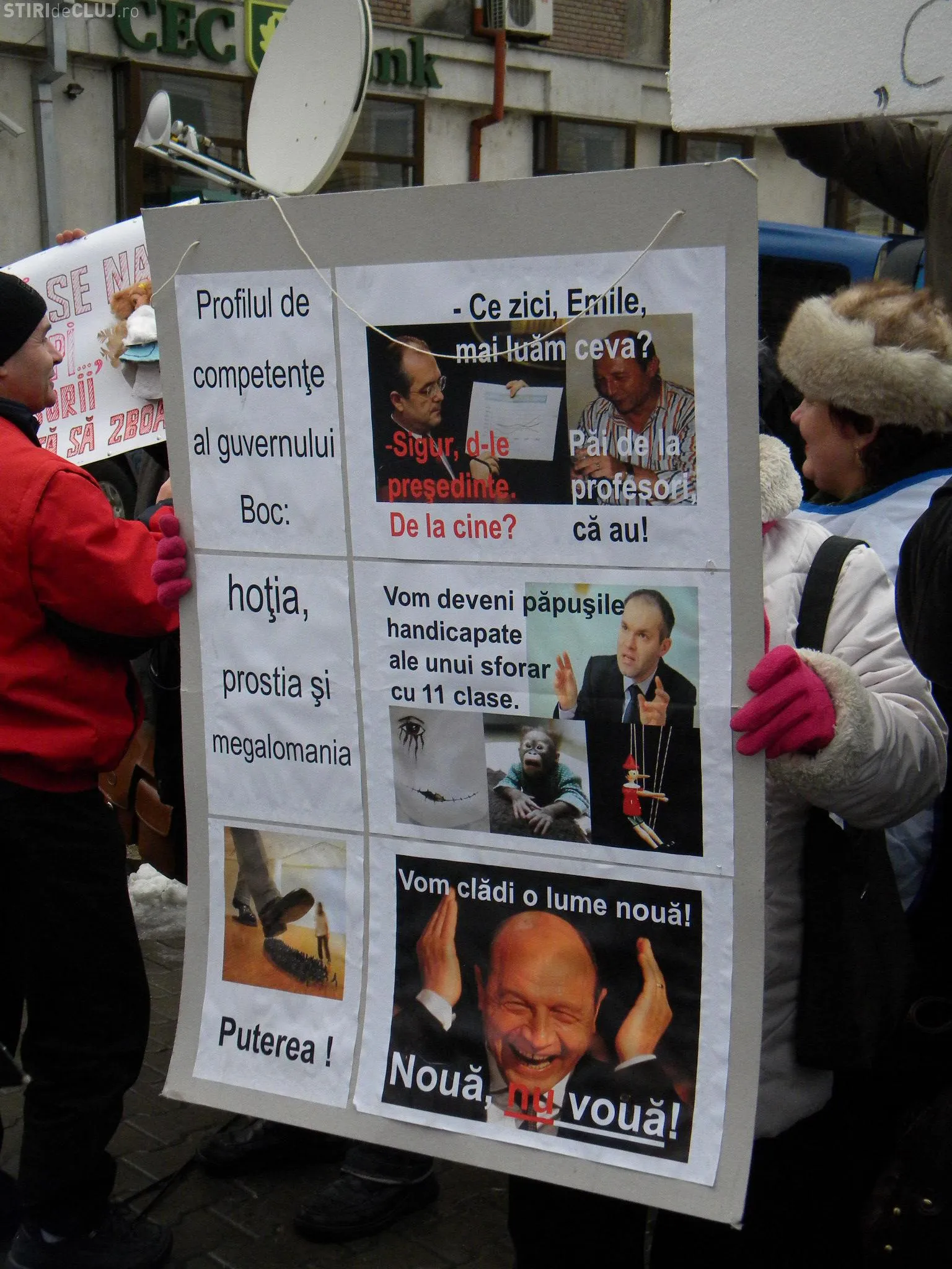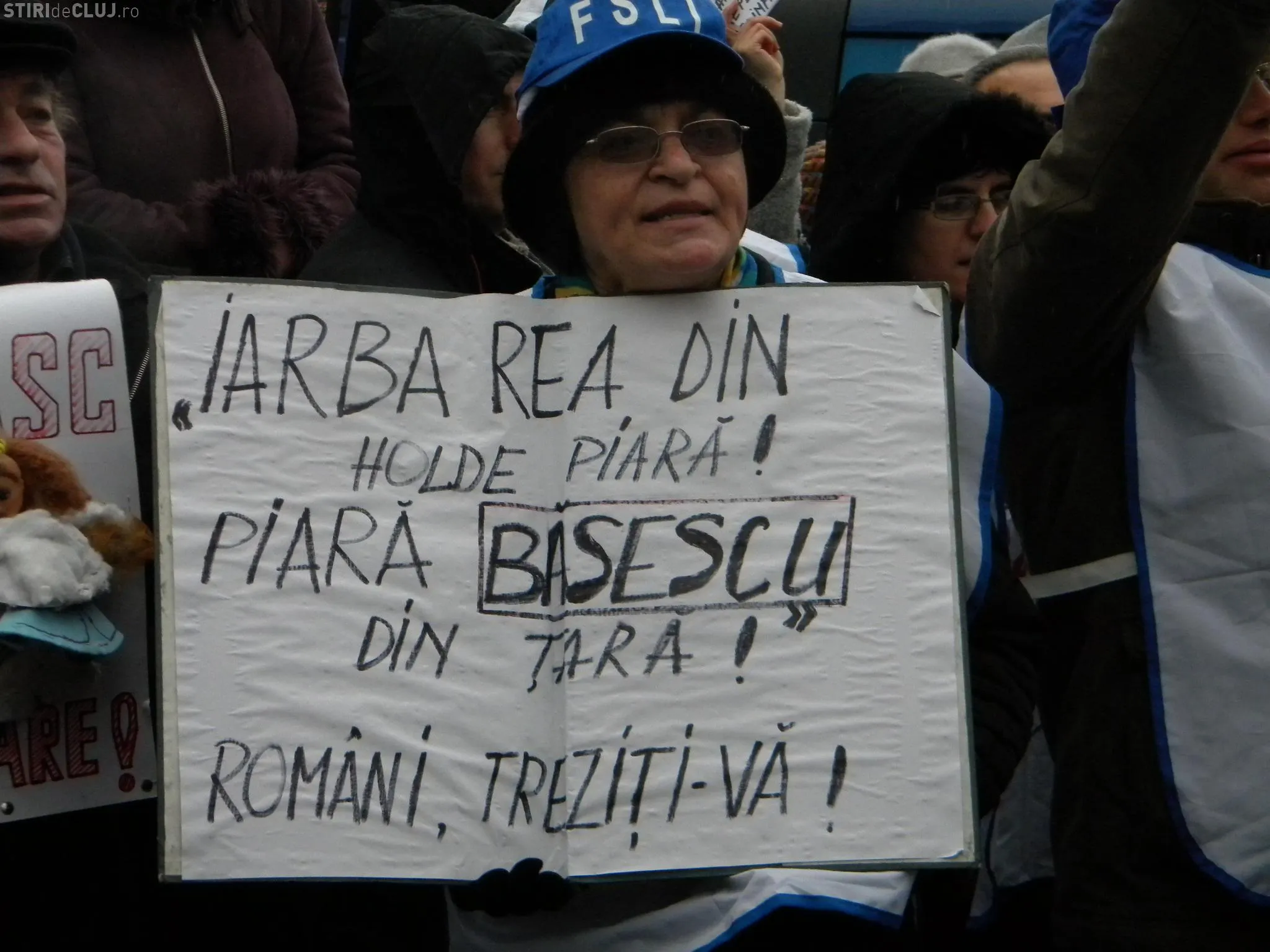 Circa 250 de sindicalisti din educatie si sanatate au protestat in fata Prefecturii Cluj, cerand demisia presedintelui si a guvernului, dar si o serie de revendicari sindicale.