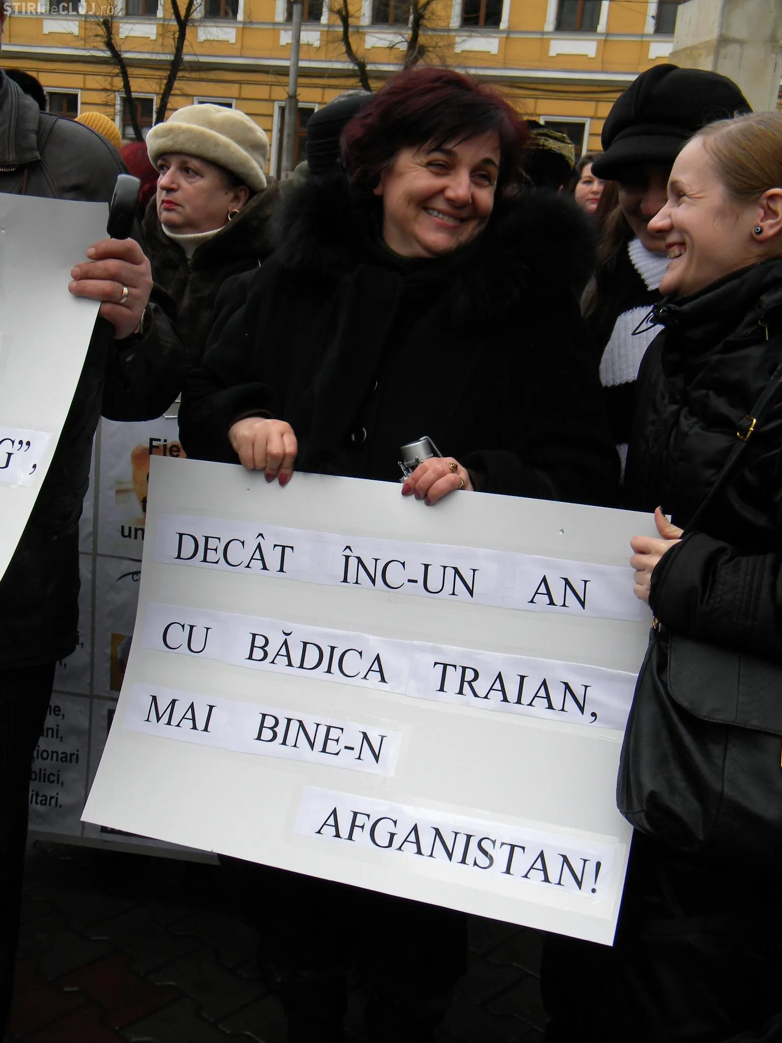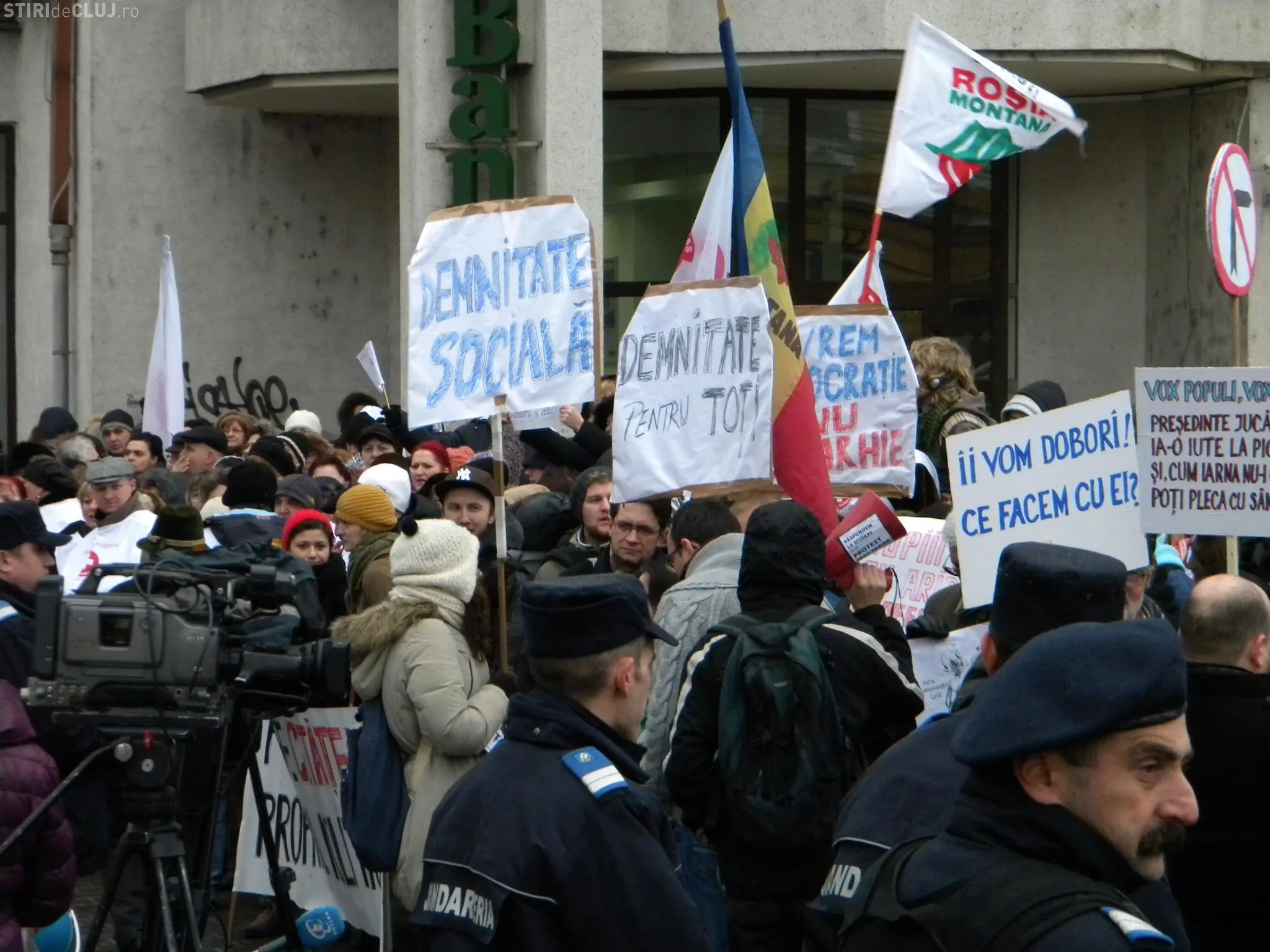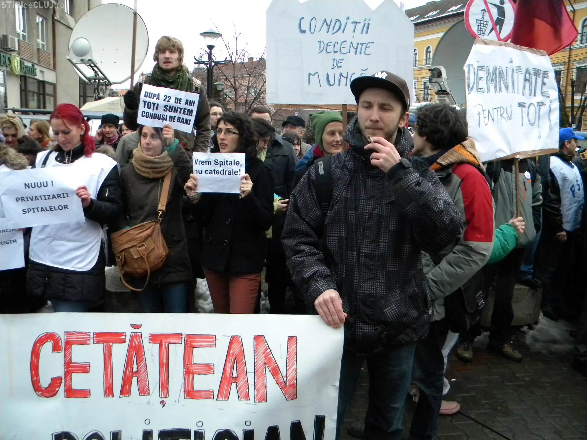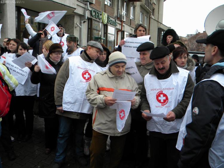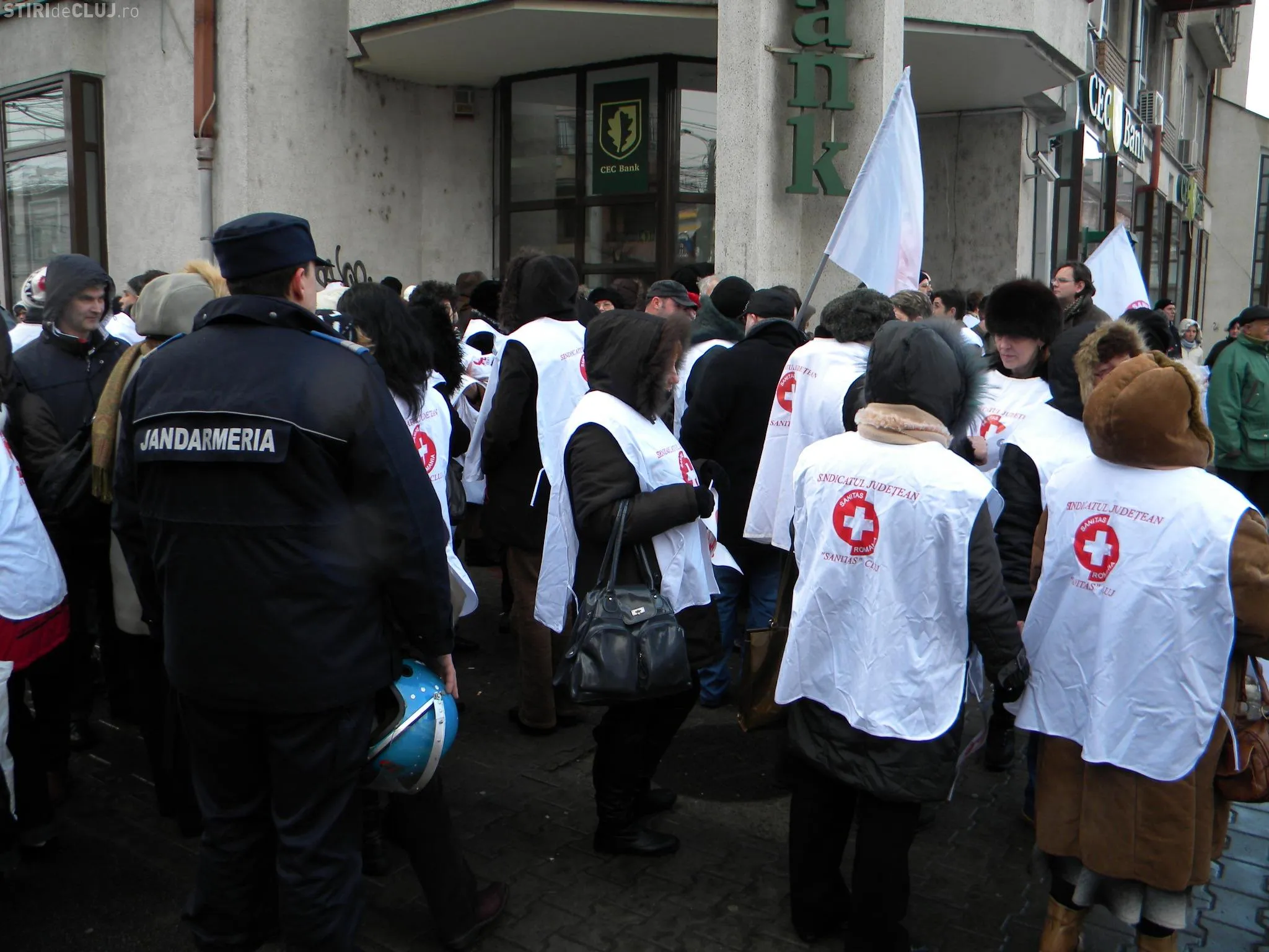 Circa 250 de sindicalisti din educatie si sanatate au protestat in fata Prefecturii Cluj, cerand demisia presedintelui si a guvernului, dar si o serie de revendicari sindicale.