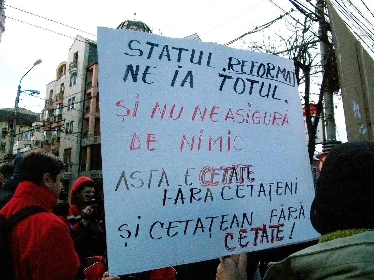 "Eu sunt una dintre protestatarii care merge in Piata Unirii de 46 de zile. Am ales sa vine si la acest protest, pentru ca am impresia ca acolo in piata nu ne baga nimeni in seama. Pana acum am protestat pe seara, dar acum am decis sa iesim la lumina zile, poate reusim sa ne si facem auziti, sa ne ia cineva in seama asteptarile. Eu nu am niciun venit, iar banii pentru medicamentele de care am nevoie, nu am de unde sa-i am, si nici daca i-as avea nu cred ca as putea sa-mi cumpar aceste pastile, din moment ce toate sistemele: economie, sanatate, administratie, sunt la pamant. Actualul sistem bazat pe spionaj nu face altceva decat sa se izoleze in lumea lui, uitand de noi", a spus o clujeanca.