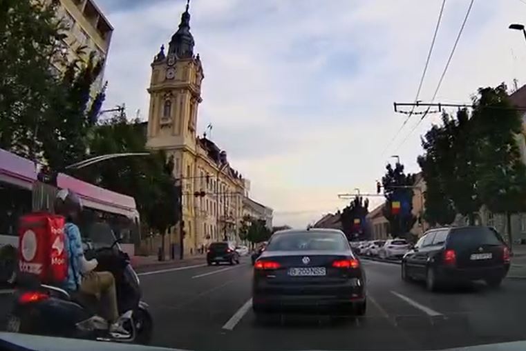 Din fericire, șoferul a fost pe fază și a oprit la timp. Fără să înțeleagă cât a fost de aproape de un impact, conducătorul scuterului se lansează într-un nou slalom printre mașini, traversând din scurt încă trei benzi de circulație, de parcă ar fi fost singur pe drum, în încercarea de a ajunge probabil pe aleea spre Parcul Central.