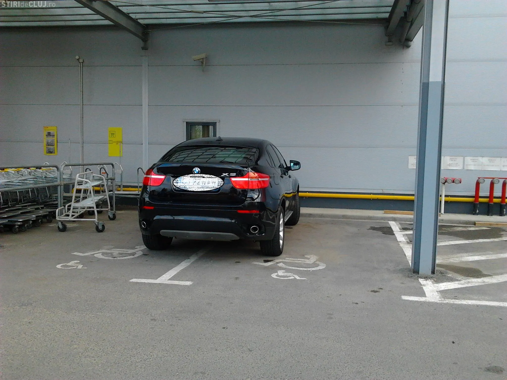 Șmecher cu BMW X6 parcat pe două locuri cu handicap la Baumax, pe Calea Turzii- FOTO