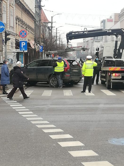 Polițiștii locali au ridicat un autoturism de teren urcat pe jumătate pe trotuar, în Piața Avram Iancu.