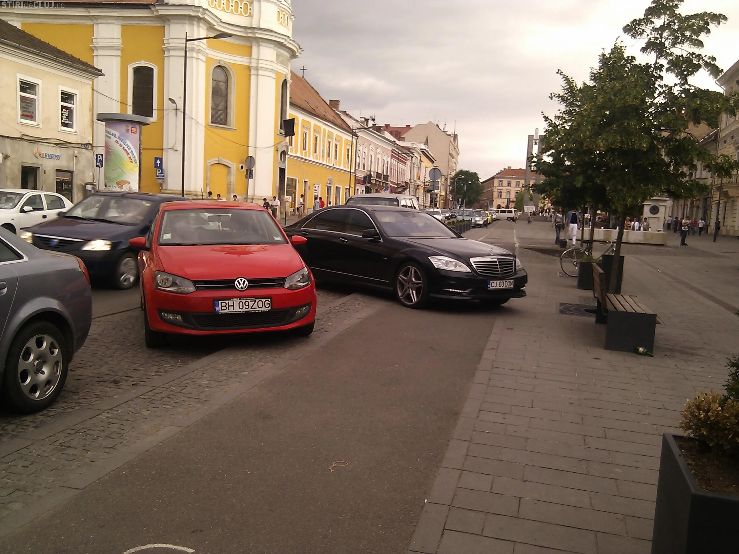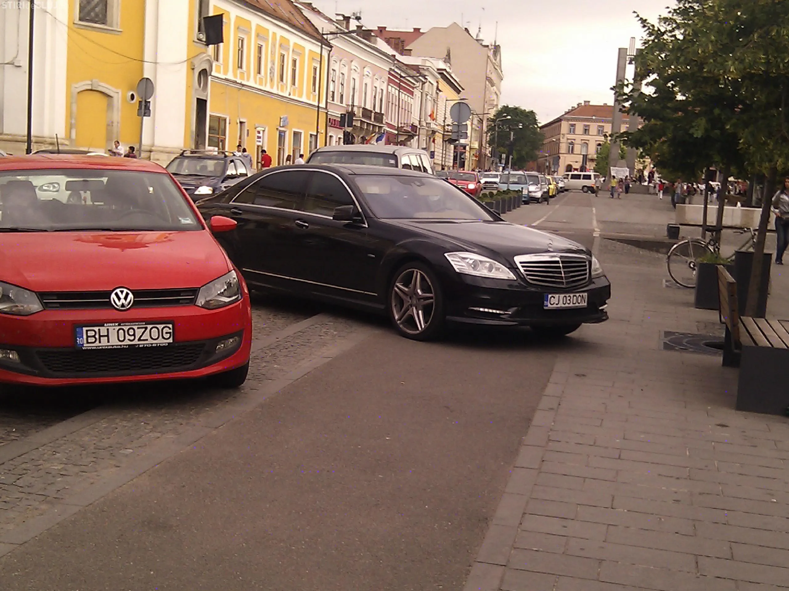 Soferul unei Mercedes de lux si-a urcat masina pe trotuarul de pe Eroilor pentru a fi cat mai aproape de terasa. Fotografiile au fost realizate duminica, 19 iunie, in jurul orei 19.30, de un cititor Stiri de Cluj.