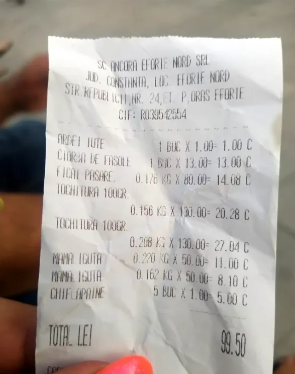 Femeia a plătit 99,5 lei pe o masă, dar șocul a venit când a văzut cât costă mămăliga. În comerț un kilogram de mălai costă 5 lei, dar pe litoral a ajuns mămăliga la preșul de 50 de lei kilogramul.