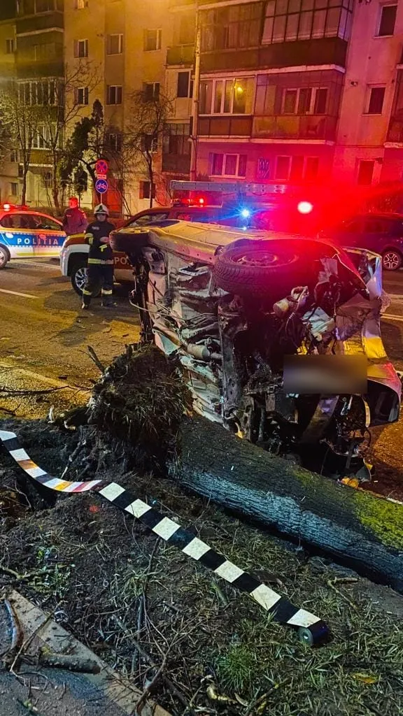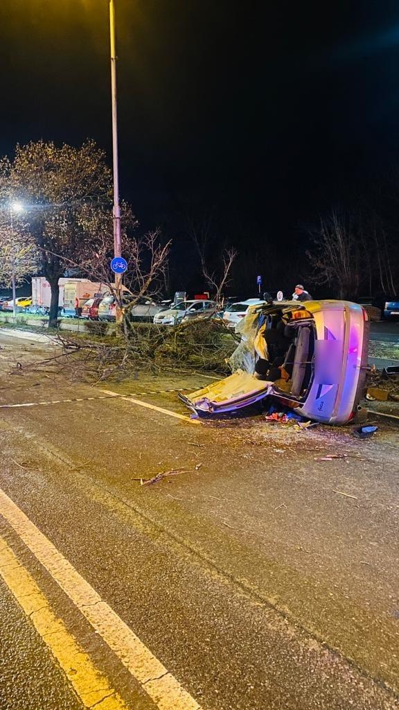 O masina s-a răsturnat azi-noapte pe strada Bucium din Cluj-Napoca. Șoferul a lovit cu viteză mare un copac, pe care l-a rupt, iar apoi s-a răsturnat.