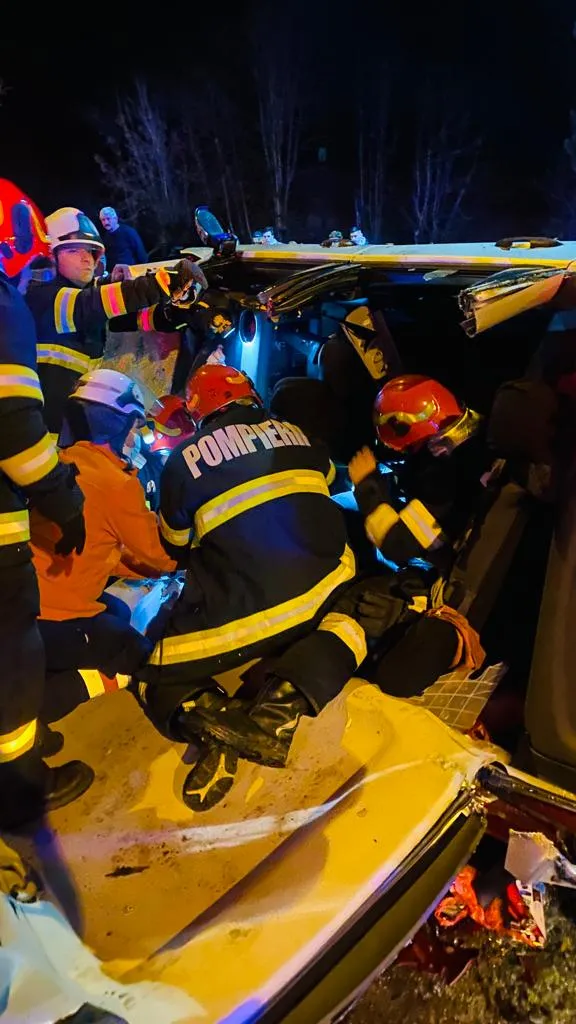 La fața locului au acționat două autospeciale cu modul de descarcerare și un echipaj SAJ, unde au găsit un autoturism răsturnat pe partea laterală și un bărbat rămas încarcerat în acesta.