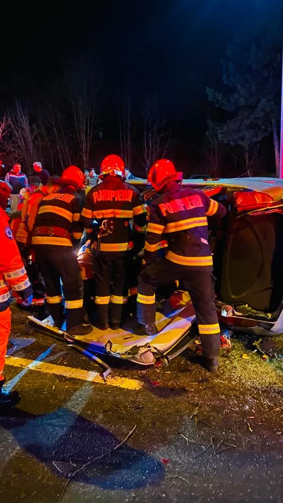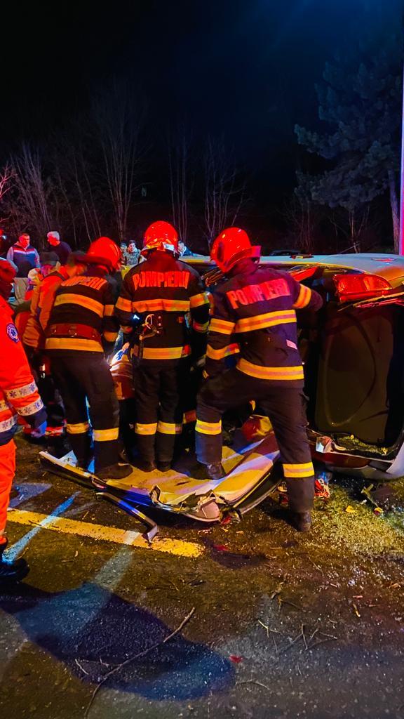 În urma impactului, autoturismul s-a răsturnat, iar conducătorul auto a rămas încarcerat.