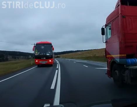 Din fericire, șoferul unui autocar care venea din contrasens a reușit să îi facă suficient loc autorului filmării, încât să poată fi evitată o tragedie.