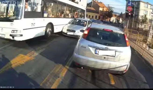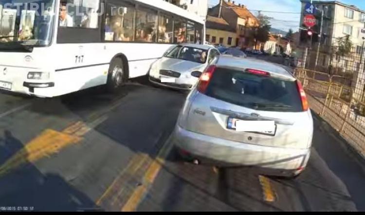 Șofer de autobuz tupeist la Cluj. A acroșat o mașină în curbă și tot el claxonează VIDEO