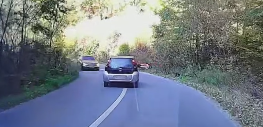 Șofer filmat în timp ce conduce pe contrasens, într-o curbă, pe un drum din Cluj. A fost la un pas de tragedie: ,,Un inconștinent” - VIDEO