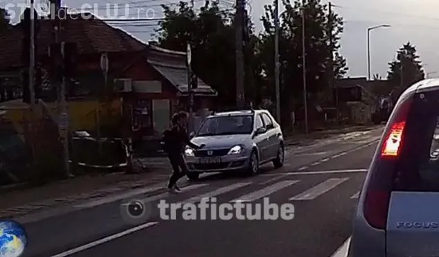 Un șofer a frânat în ultima clipă la o trecere de pietoni semaforizată, intrând cu mașina pe jumătate pe trecerea de pietoni. Acolo se afla angajată în traversare o fetiță, care a avut inspirație și a luat-o la fugă când a văzut mașina, conform Trafic tube.