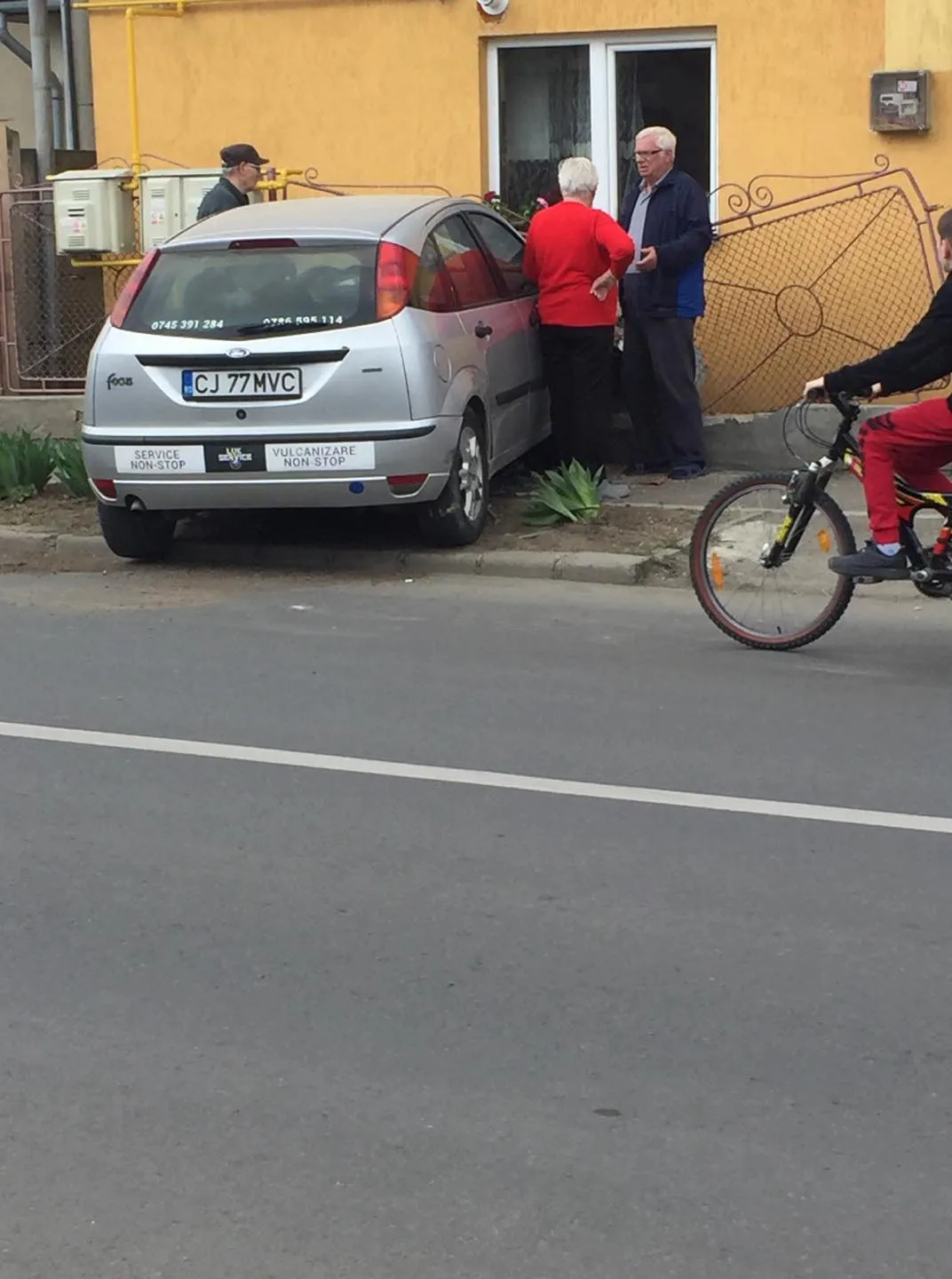 În urma impactului, autoturismul Ford a fost proiectat în zidul unei case.