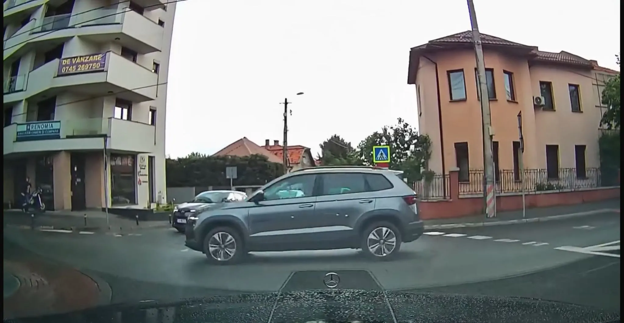 Un incident periculos a fost surprins recent într-un sens giratoriu din Cluj, unde un șofer grăbit a încălcat flagrant regulile de circulație