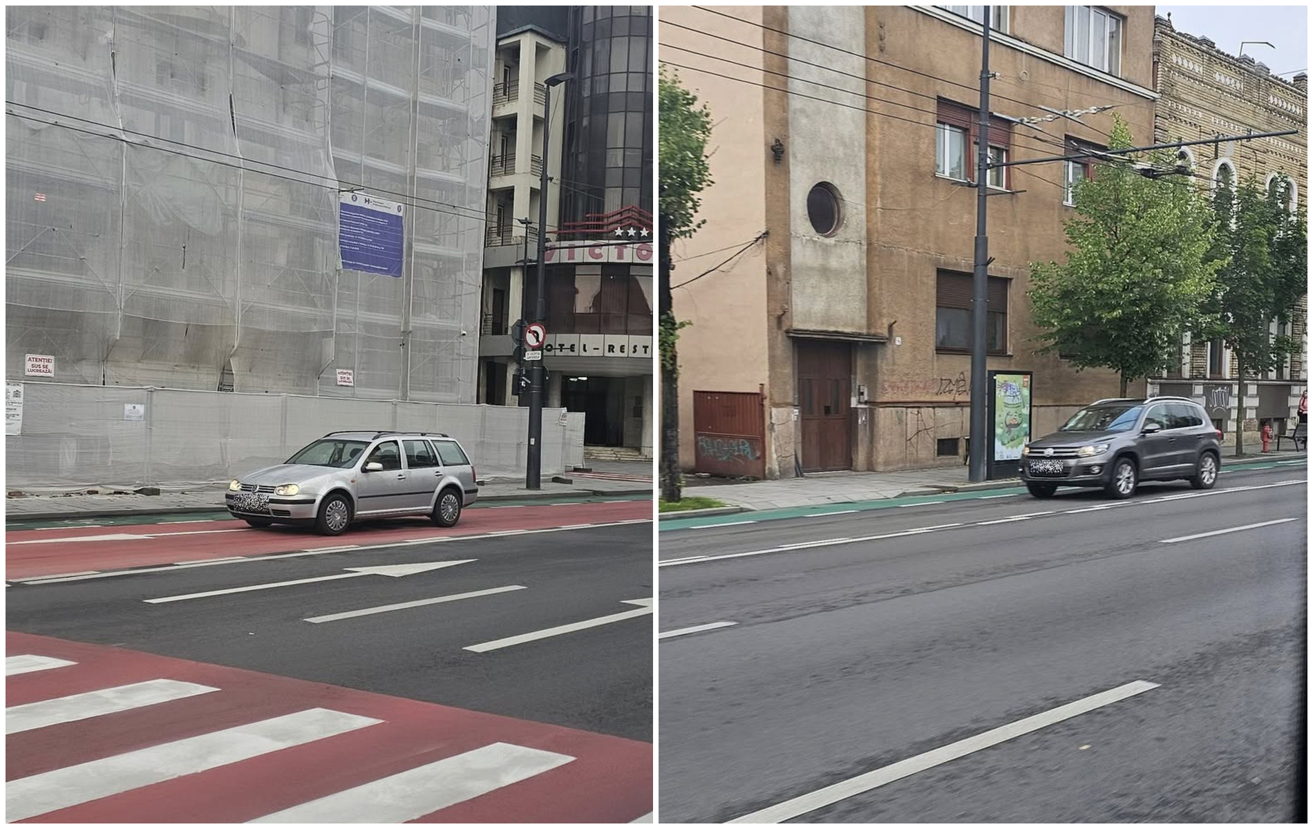 Un trecător din Cluj-Napoca a surprins în mai puțin de câteva două minute două astfel de mașini, cu număr de înmatriculare din alte județe, care circulau nestingherite pe acolo unde, conform legii, doar autobuzele, troleibuzele sau mașinile de taxi cu client pot circula.