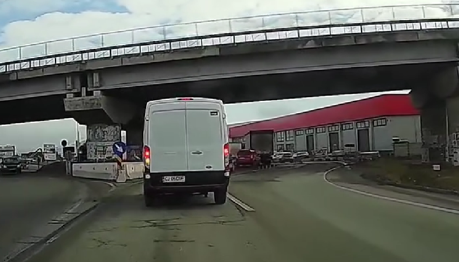 Un astfel de moment, în care o dubiță alunecă pe carosabil, a fost surprins de camera de bord a unui participant la trafic și publicat pe o rețea de socializare.