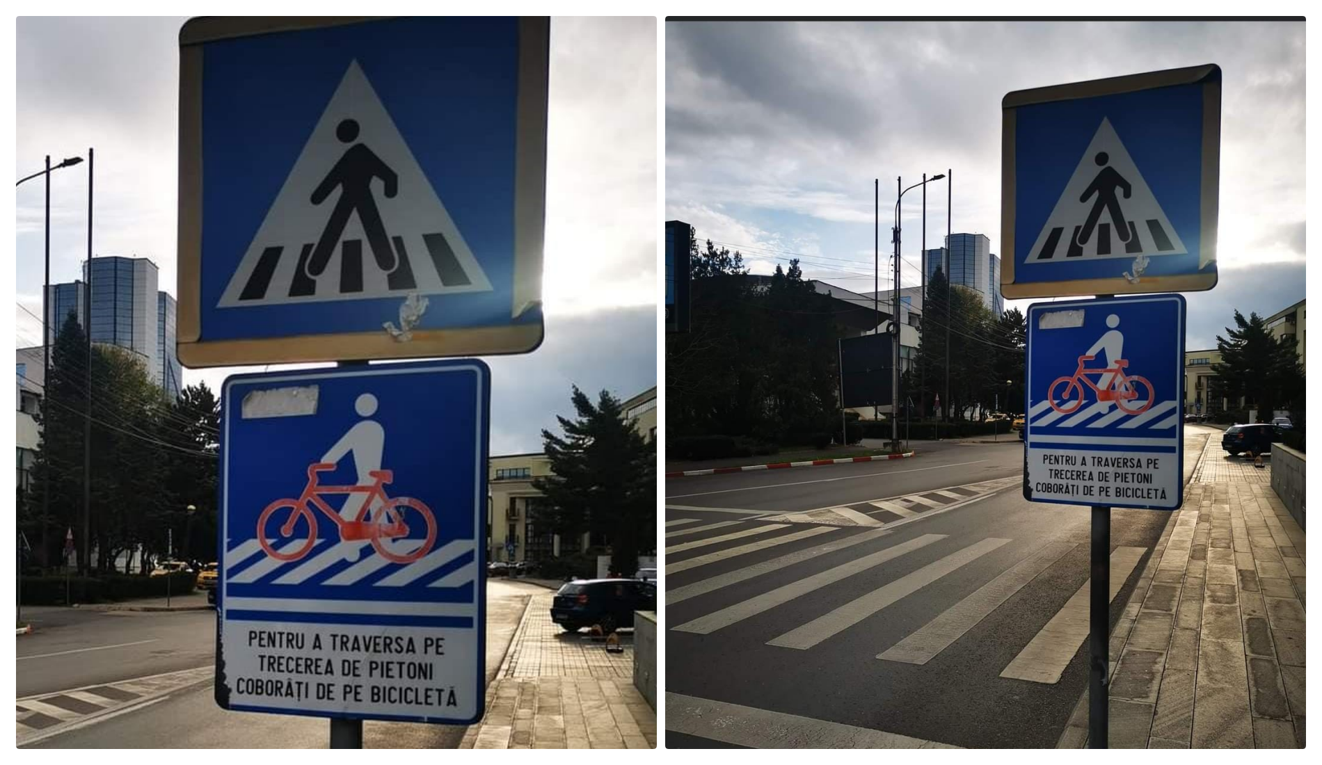 Pe aceste indicatoare prezente deja în Sibiu apare mesajul ”Pentru a traversa pe trecerea de pietoni coborâți de pe bicicletă!”. Clujul s-a umplu de trecere de pietoni și piste de biciclete realizate nu cel mai bine, iar cei ”pe două roți” folosesc frecvent trecerile de pietoni pentru a circula, fără a coborî de pe ele.