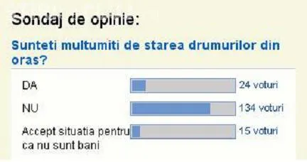 Din 173 de votanti, 134 s-au declarat nemultumiti de modul in care se prezinta drumurile, 15 au afirmat ca sunt resemnati pentru ca nu sunt bani, iar 24 au spus ca soselele din Cluj Napoca sunt bune si nu au nicio nemultumire.
