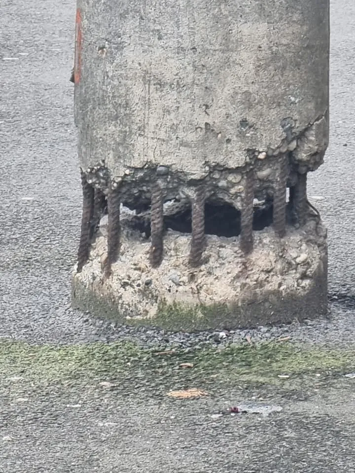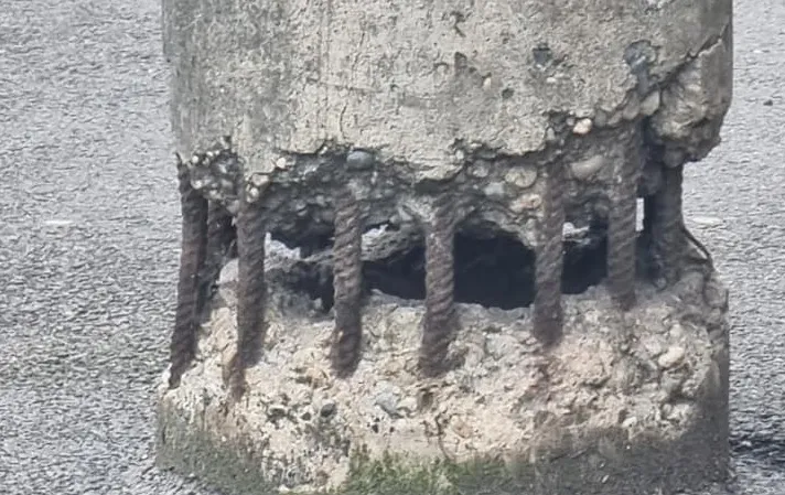 Baza unui stâlp din beton, de pe o stradă intens circulată, se ține numai în fierul beton, riscând să cadă oricând.