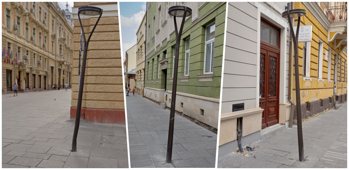 Stâlpișorii pentru iluminatul public par strâmbi, amplasați chiar în bătaie de joc pe alocuri.