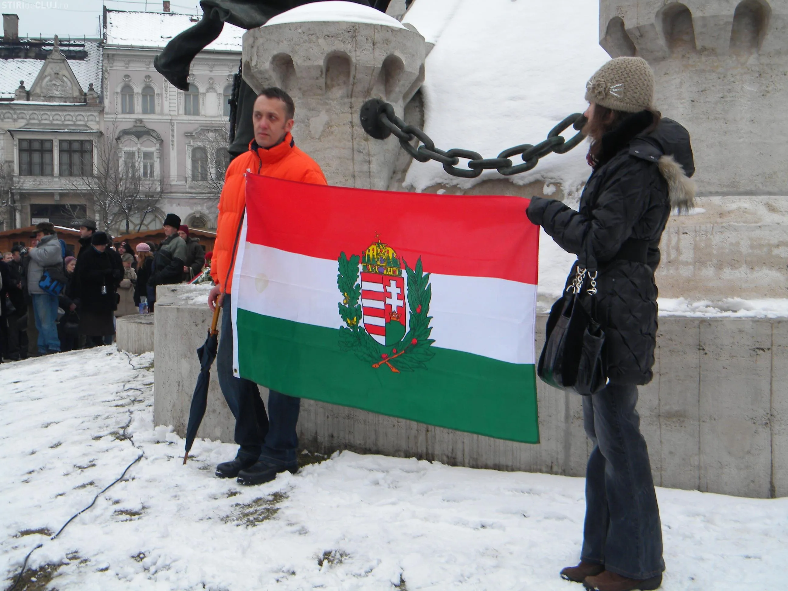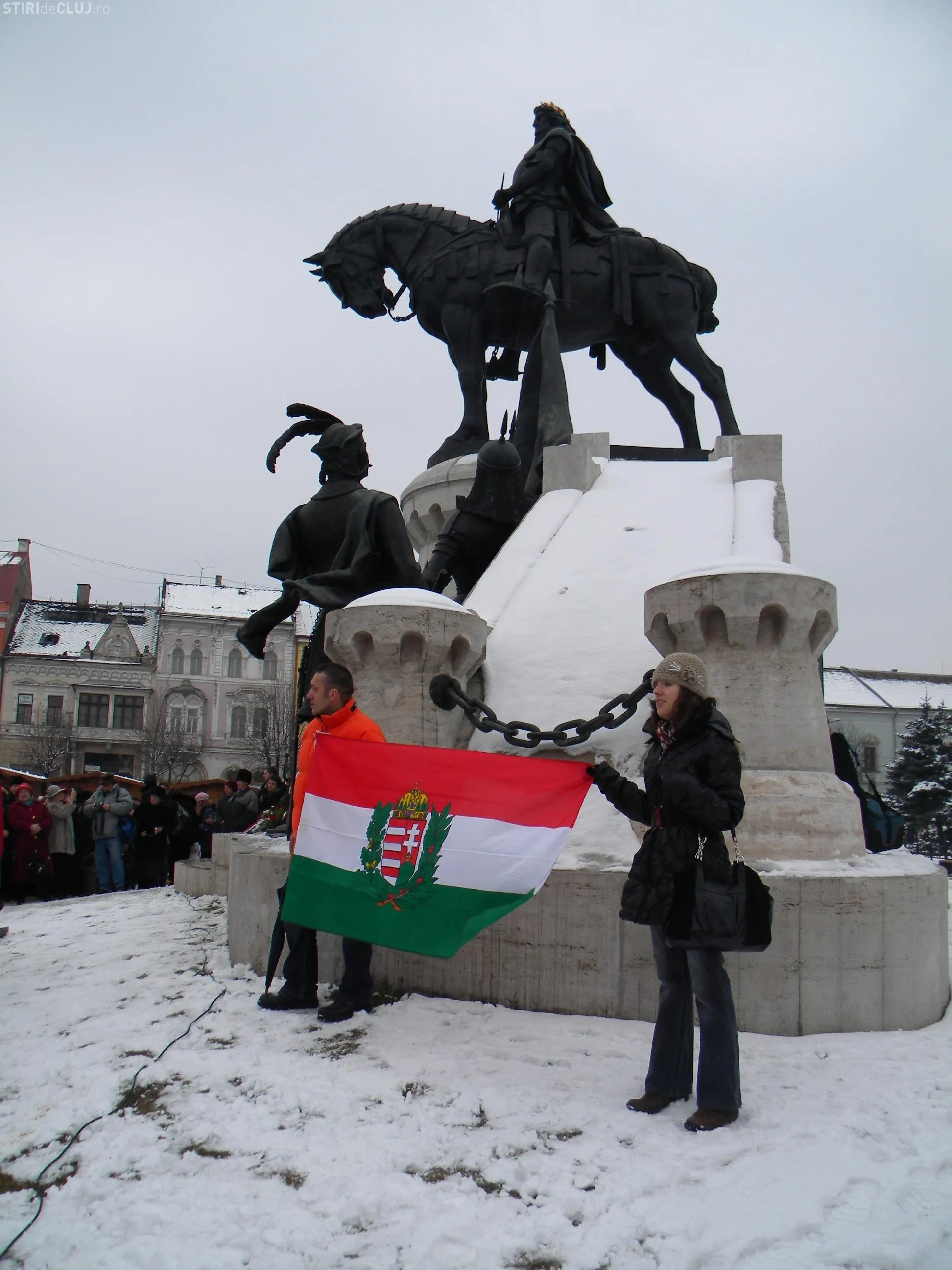 Steagul Ungariei a fost afisat, miercuri, 23 februarie, la manifestarea organizata de UMDR in Piata Unirii, in cinstea lui Matei Corvin, nascut acum 568 de ani la Cluj Napoca.