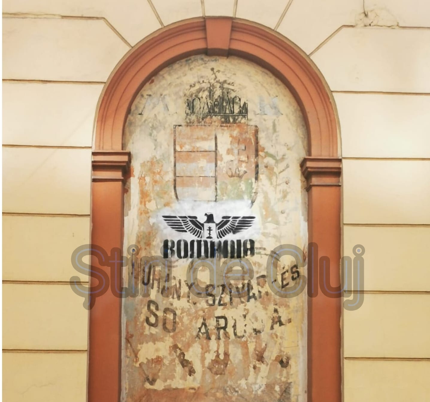Stema Ungariei, ieșită la iveală după restaurarea unei clădiri vechi din Cluj-Napoca, a fost vandalizată în urmă cu un an. Peste stemă a fost imprimat cu vopsea neagră cuvântul „România” și un vultur, despre care s-a spus că ar semăna cu cel nazist. Nici până astăzi nu a fost sters.