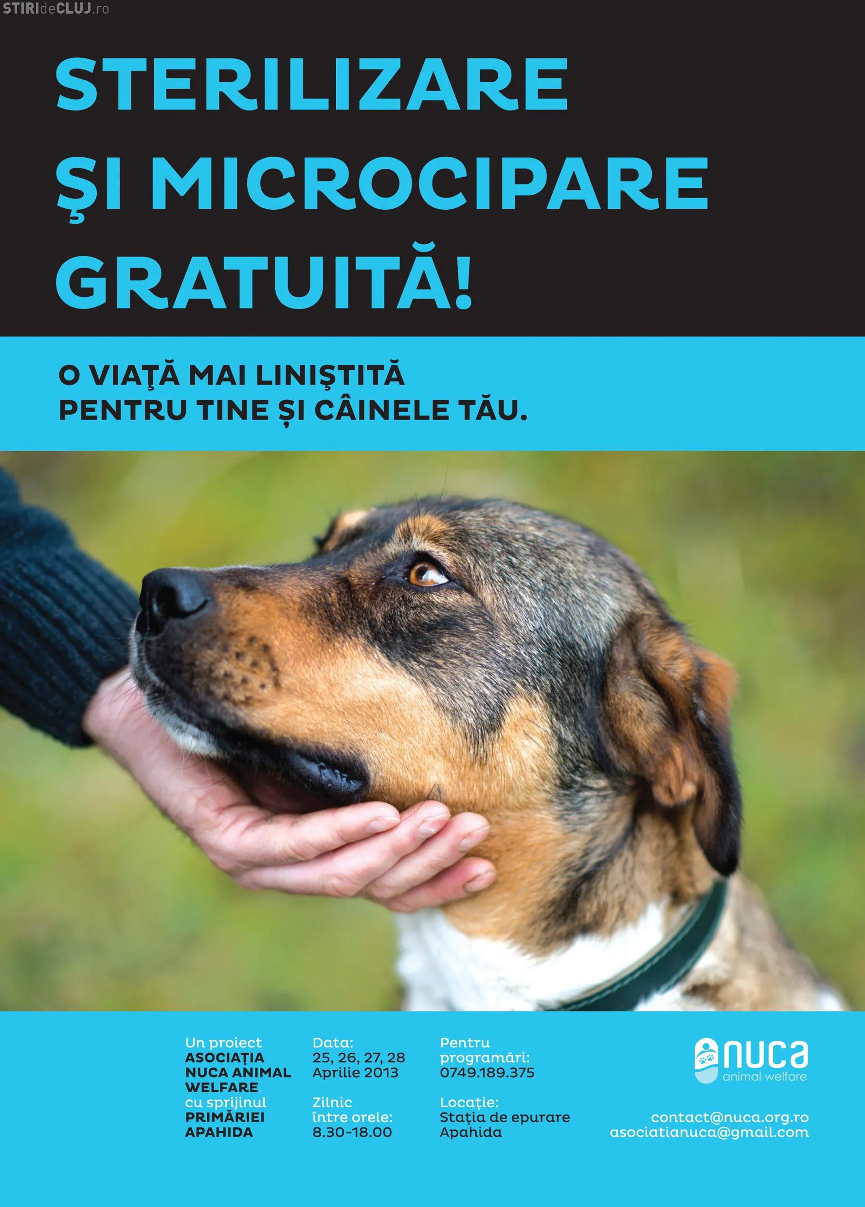 Asociaţia NUCA organizează gratuit o actiune de sterilizare de sterilizare şi microcipare gratuită pentru câinii cu şi fără stăpân din comuna Apahida, judeţul Cluj.