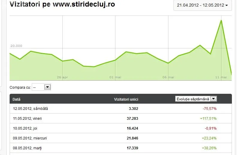 Stiri de Cluj a avut vineri, 11 mai, cel mai mare numar de cititori de la infiintare, dar, totodata, si din istoria publicatiilor online din Cluj.