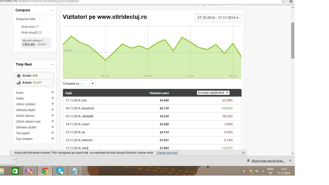 Din traficul total intregistrat ieri de Stiri de Cluj (26.719 vizitatori unici ieri-16.11.2014), peste jumatate sunt cititori clujeni -50.97% (11.388 vizitatori cu IP-uri de Cluj), un procent extrem de important pentru noi, mai ales in conditiile in care toate celelalte site-uri nu ajung la 40%.