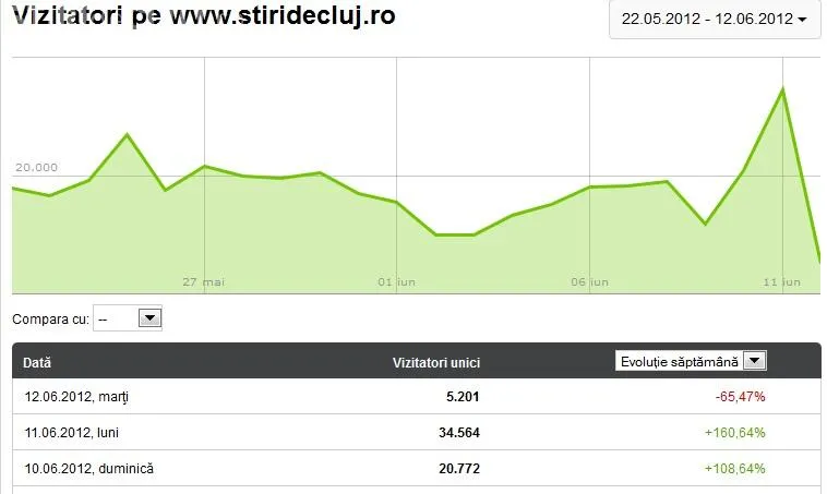 Potrivit trafic.ro, in 11 iunie, Stiri de Cluj a avut 34.564 de cititori unici, din care 19.666 au fost din judetul Cluj.
