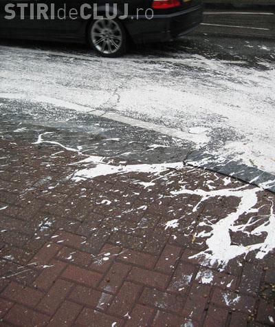 Zona din fața Bibliotecii Universitare Octavian Goga din cartierul Mărăști a fost ”pictată” de roțile mașinilor, după ce o cantitate semnificativă de vopsea a curs dintr-o autoutilitară.