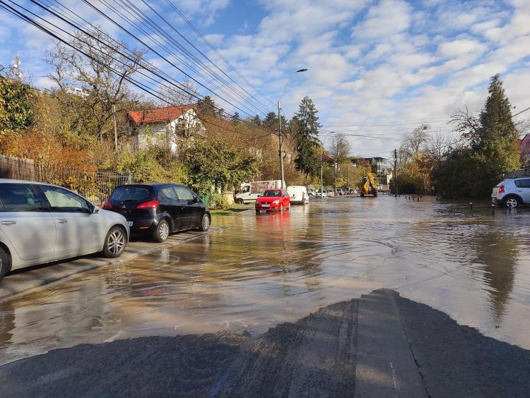 Inundații pe o stradă din Cluj-Napoca după ce o conductă subterană a fost avariată - VIDEO