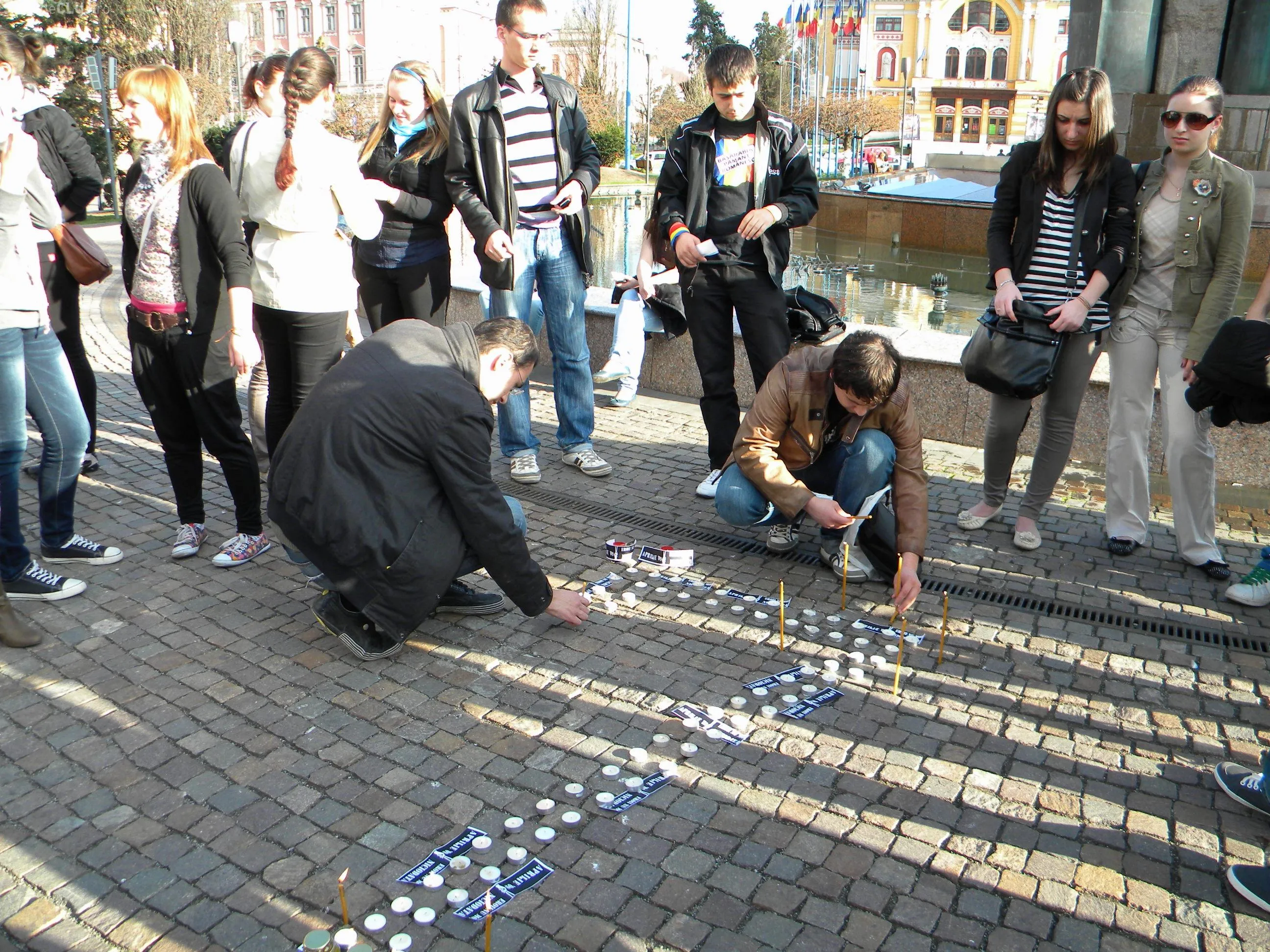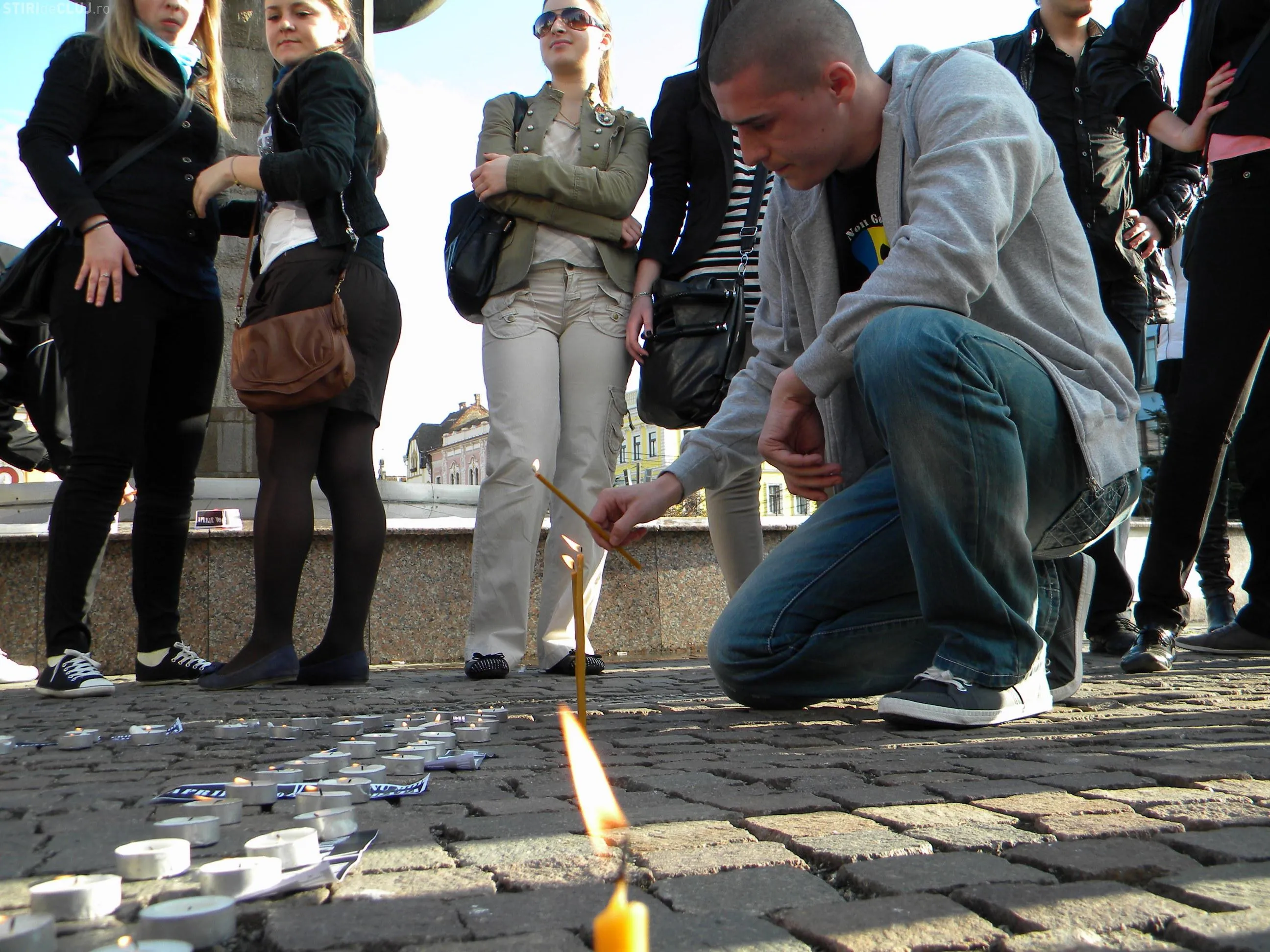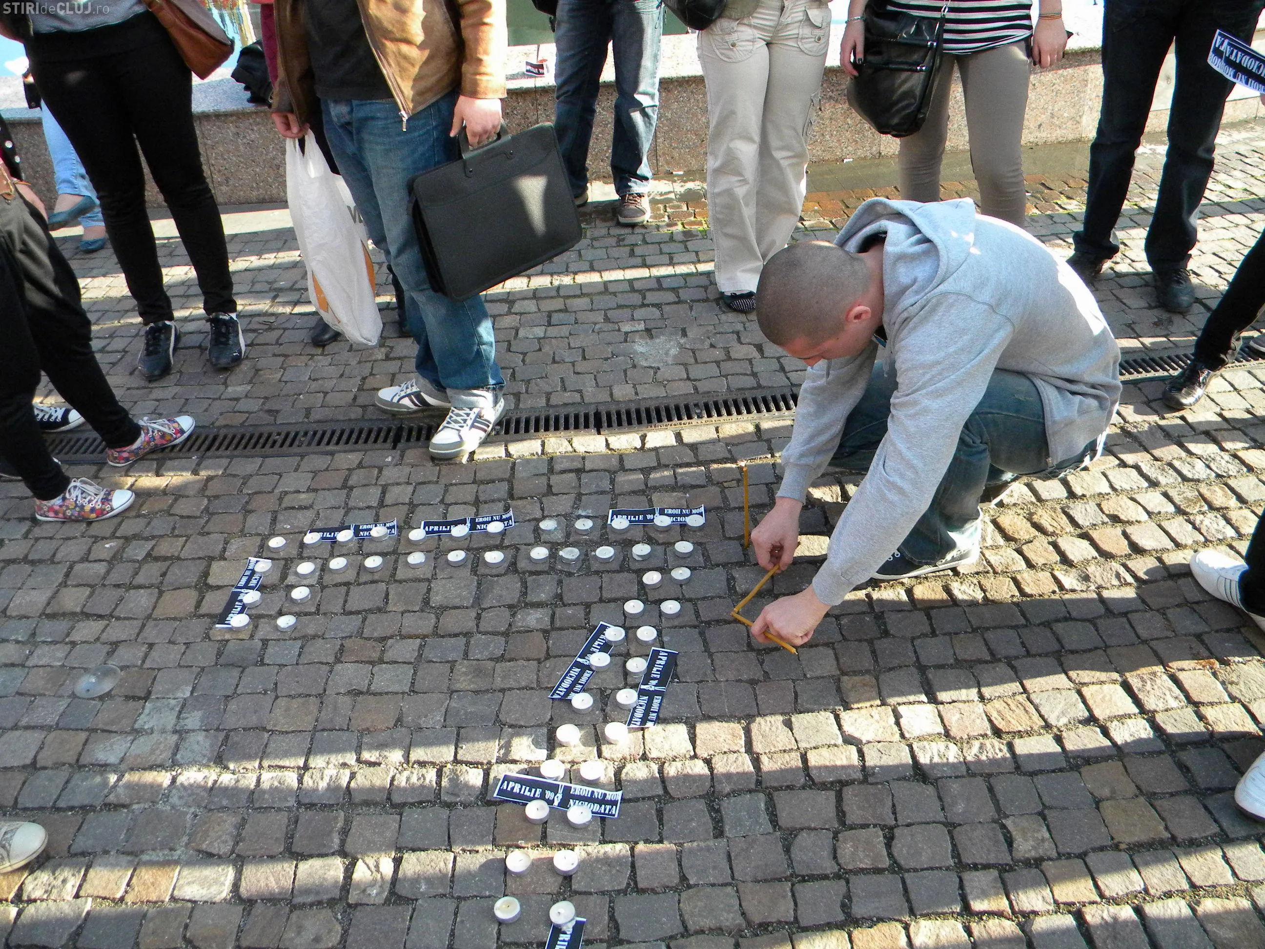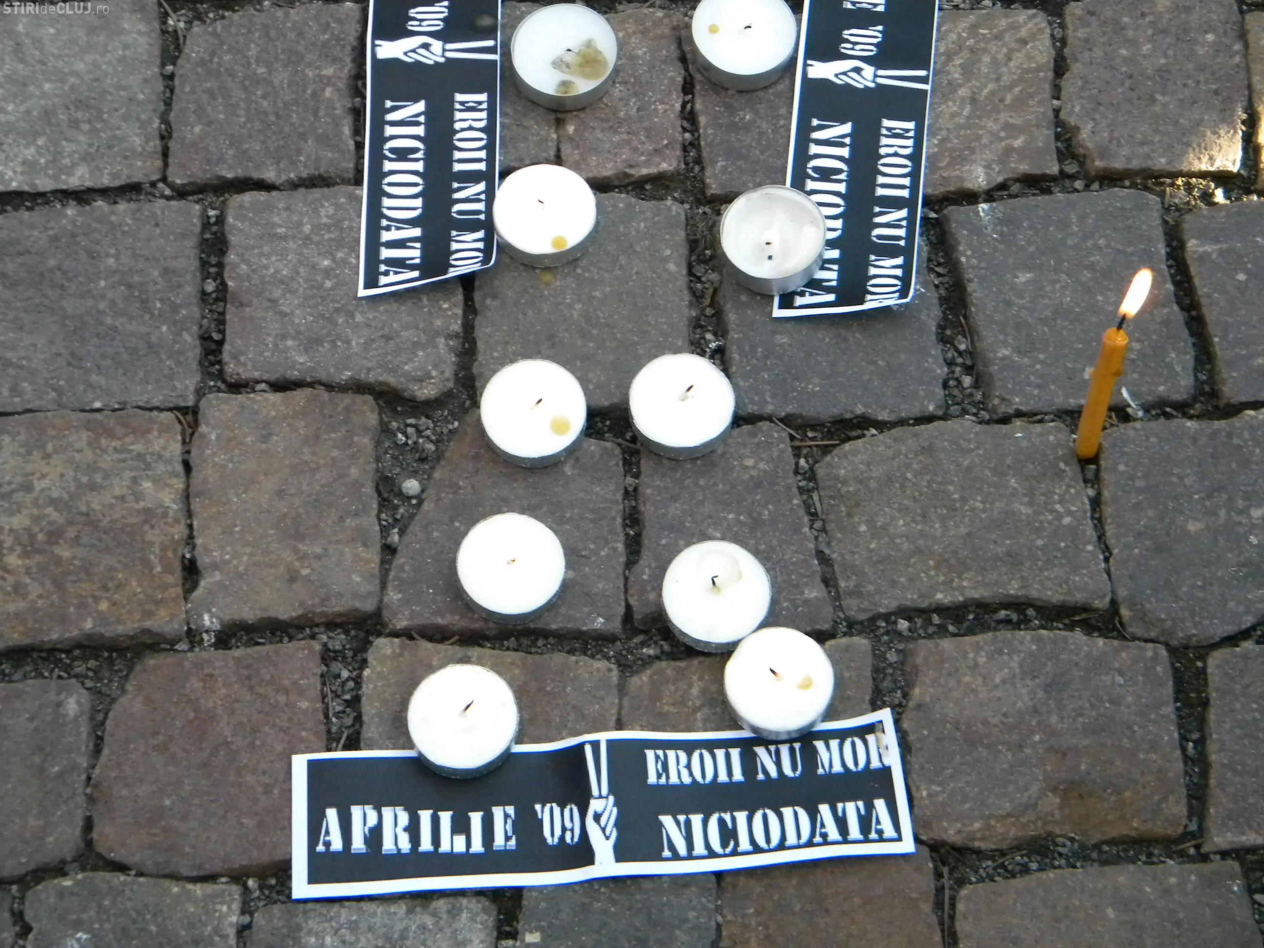 Tinerii au tinut in Piata Avram Iancu un moment de reculengere, au aprins lumanari, formand cifra 7, si au asezat pe jos cateva hartii cu mesajul "Aprilie - eroii nu mor niciodata".