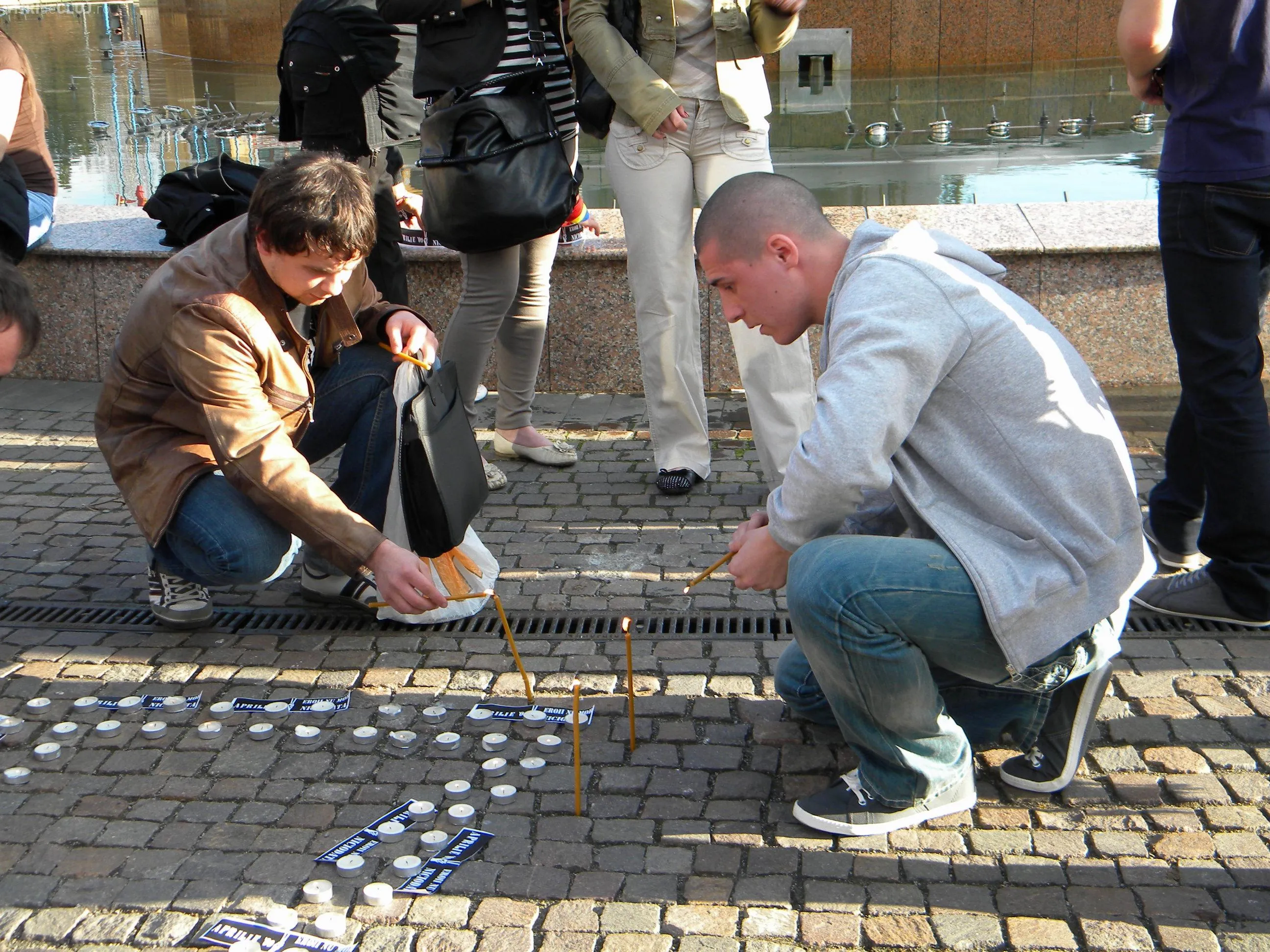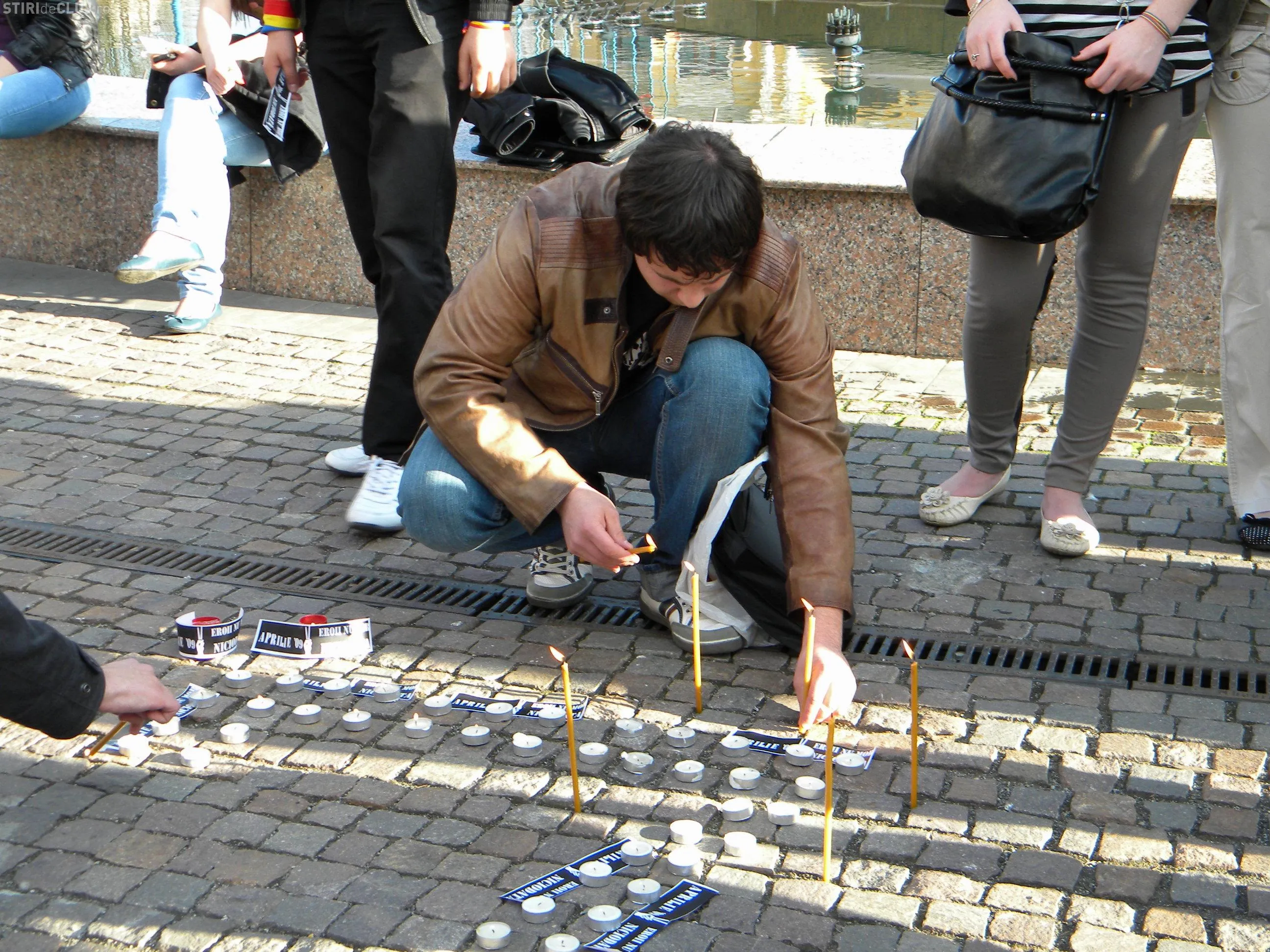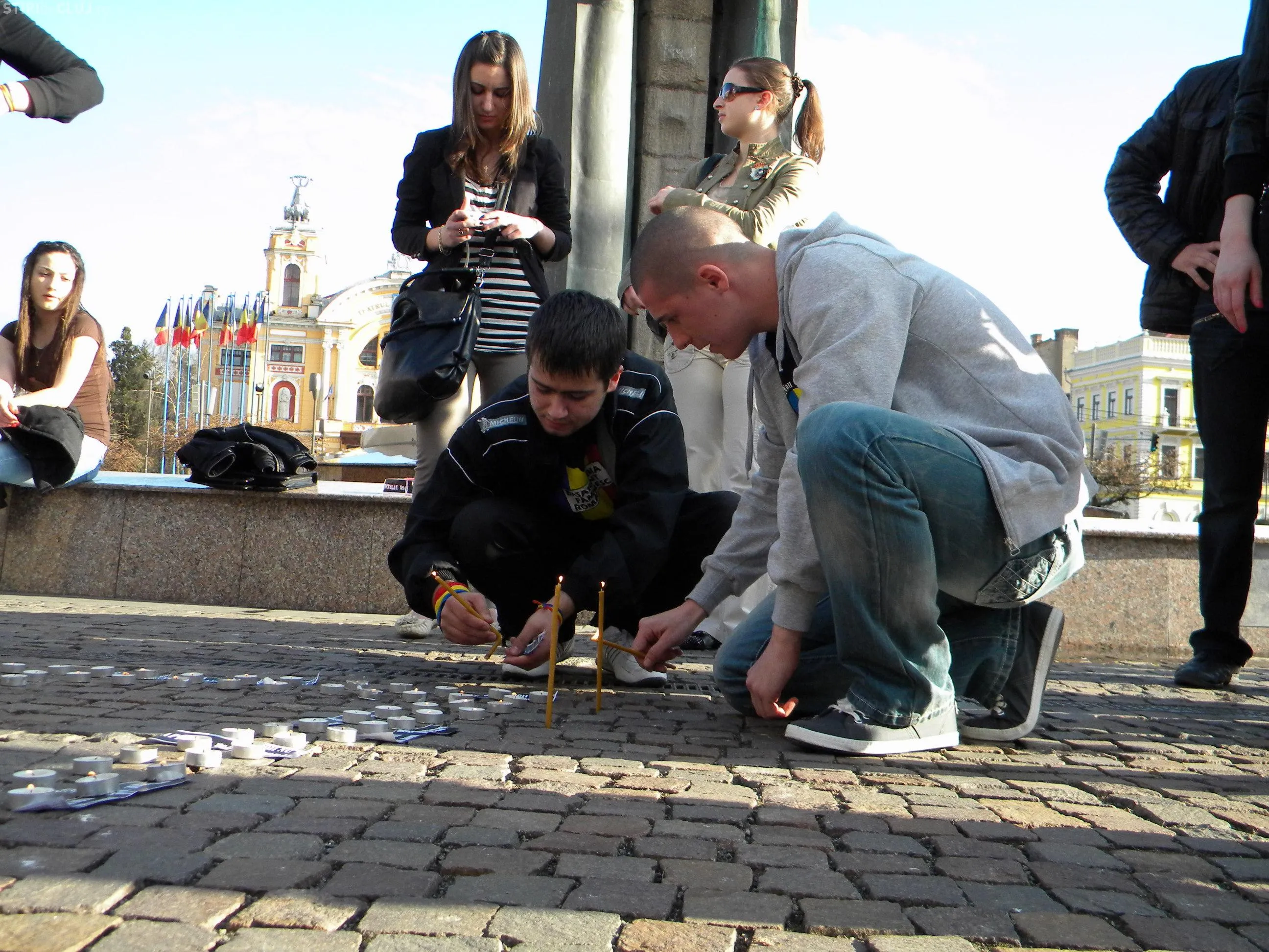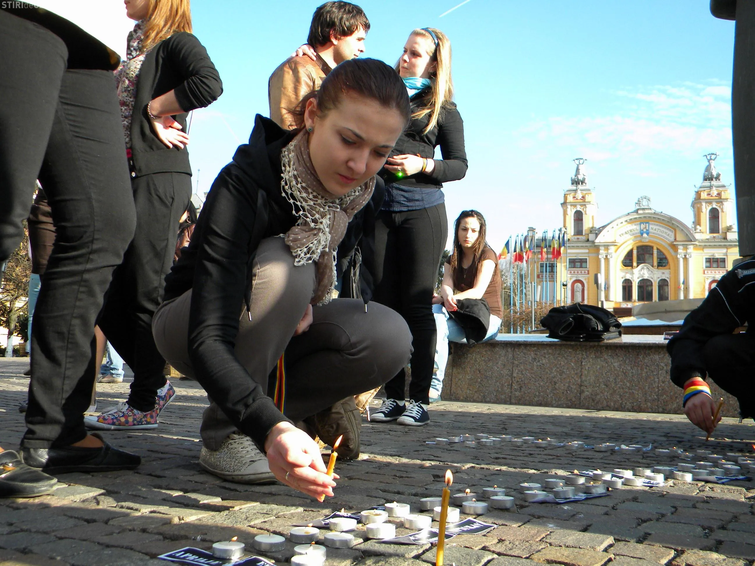 Tinerii au tinut in Piata Avram Iancu un moment de reculengere, au aprins lumanari, formand cifra 7, si au asezat pe jos cateva hartii cu mesajul "Aprilie - eroii nu mor niciodata".