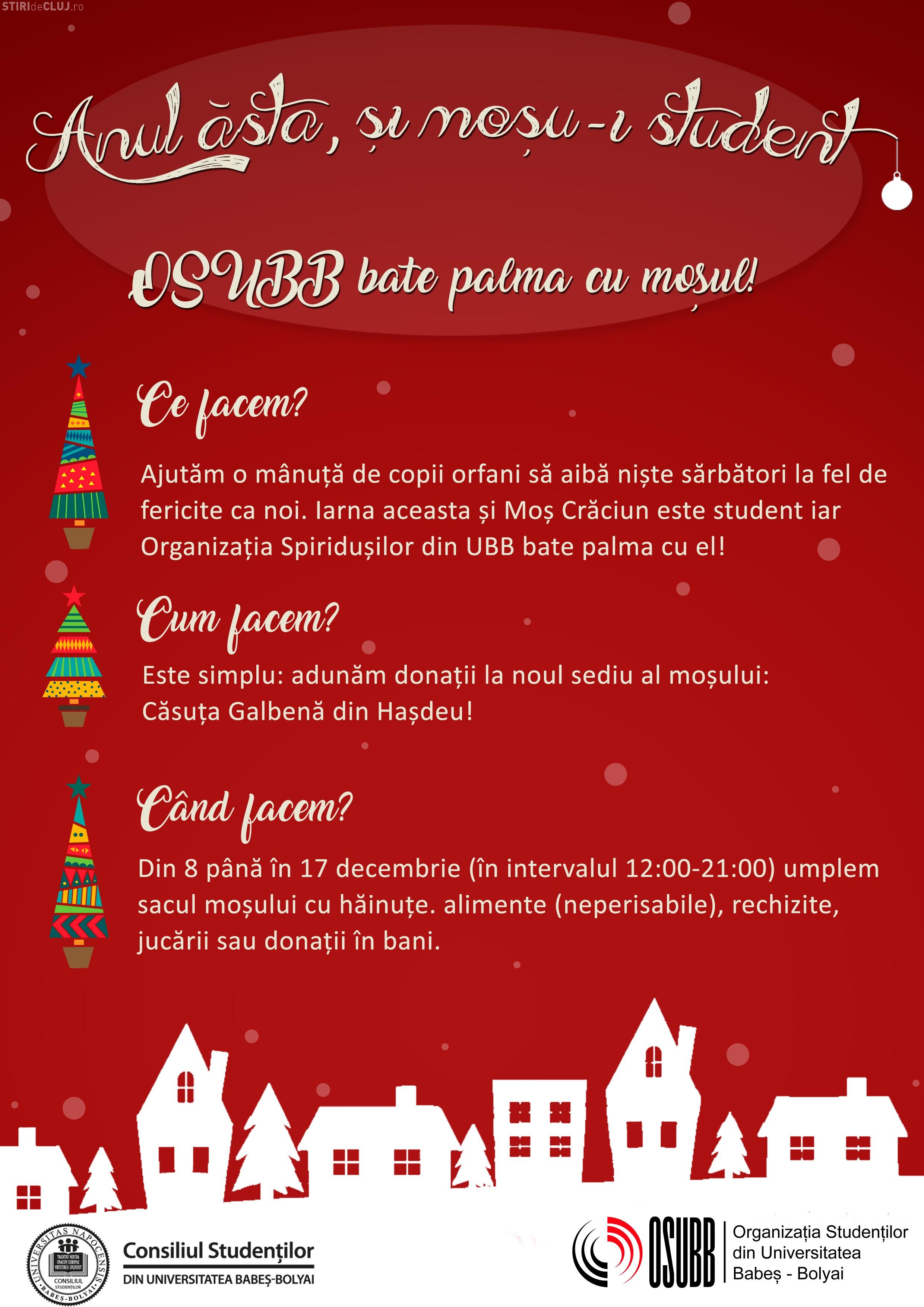 Organizația Studenților din Universitatea Babeș-Bolyai (OSUBB) derulează, în perioada 8.12 - 18.12.2016 campania de Crăciun intitulată ”Anul ăsta și Moșu-i student”.