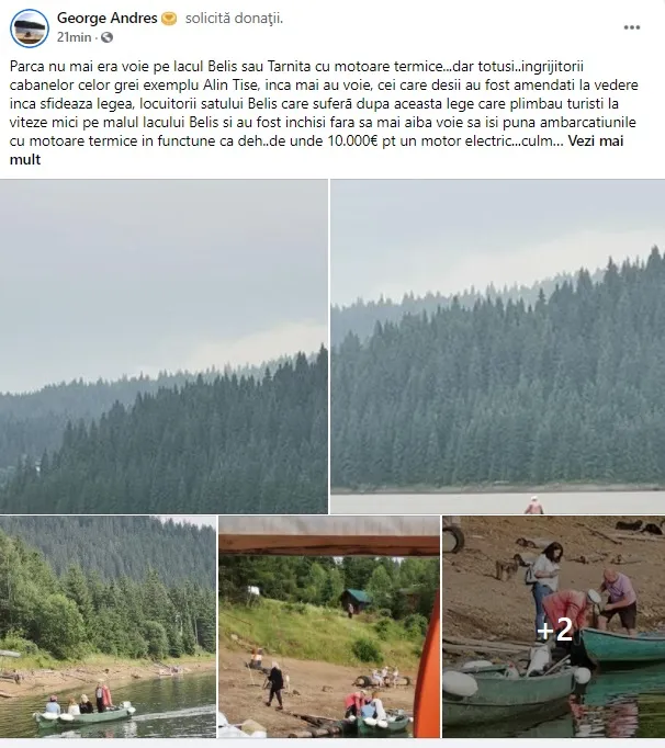 Pe contul lui de Facebook se poate vedea mai jos care este de fapt supărarea. El promovează un anunț prin care se vinde o barcă, care nu mai poate fi folosită pe Beliș.