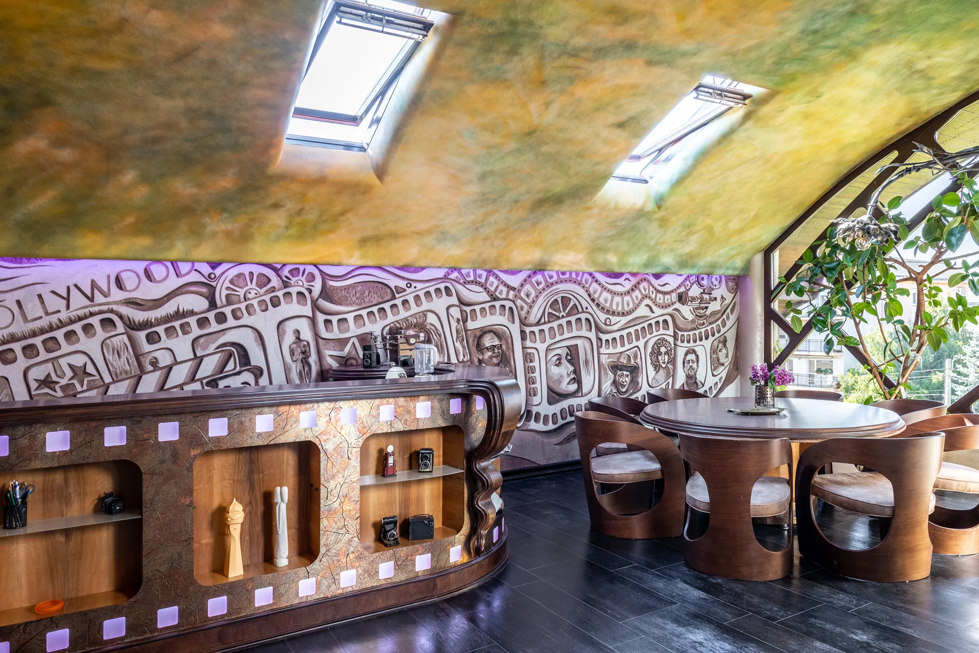 Tot la mansardă pe peretele din spatele barului regăsim o opera de artă realizată prin tehnica sgraffito, o tehnică de peste 200 de ani, in 7 straturi de tencuială de nuanțe diferite.
