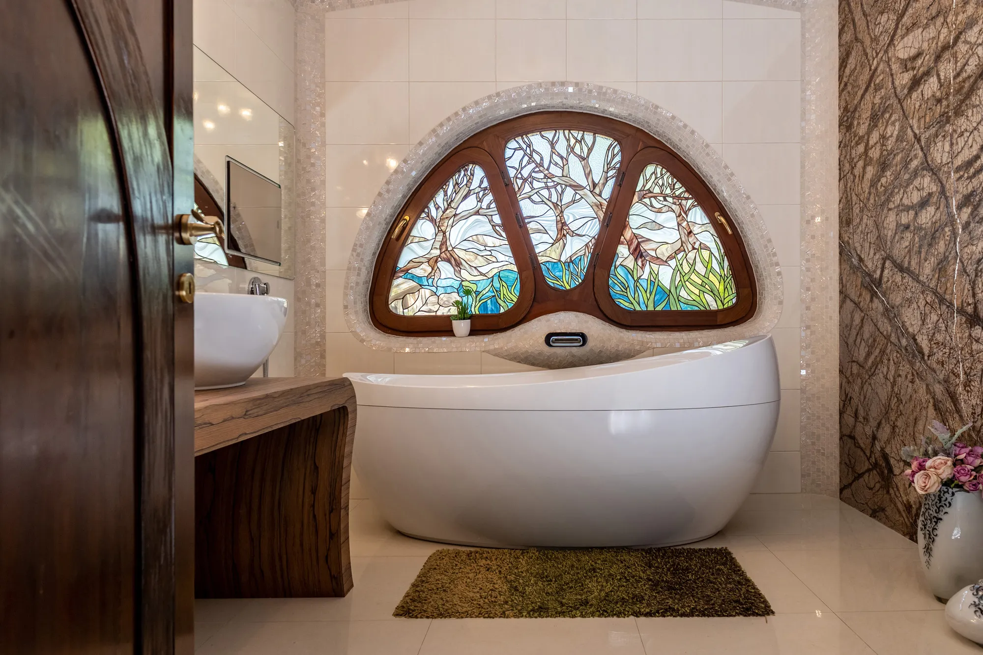 Ușa de la intrare, la fel ca tâmplăria din întreaga locuință, este din lemn Larice siberian și vitralii. Vitraliile care se regăsesc in întreaga locuință sunt realizate manual în tehnica Tiffany. În holul de la intrare ne întâmpină tavanul in forma de vortex.