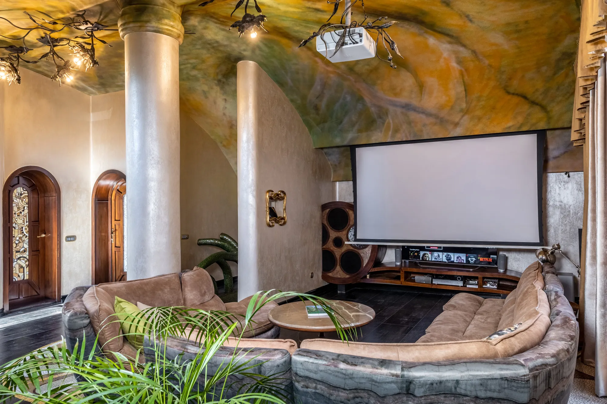 - o altă zonă este zona de entertainment in care găsim o canapea modulară, un televizor și un ecran de proiecție electric care coboară din tavan.