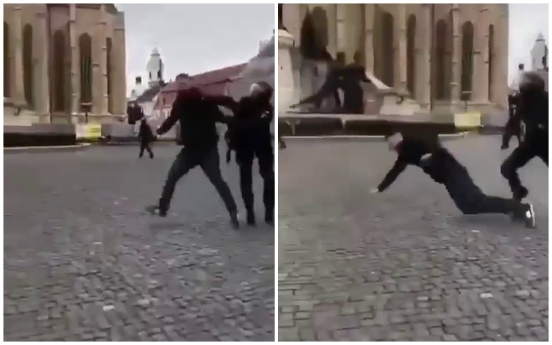 Cei din galeria Stelei au fost agresivi la un moment dat în Piața Unirii. Nu este clar ce s-a întâmplat, dar tânărul apare fugind, iar un jandarm l-a ajuns din urmă și i-a aplicat o lovitură fatală. Bărbatul a căzut lat la pământ.