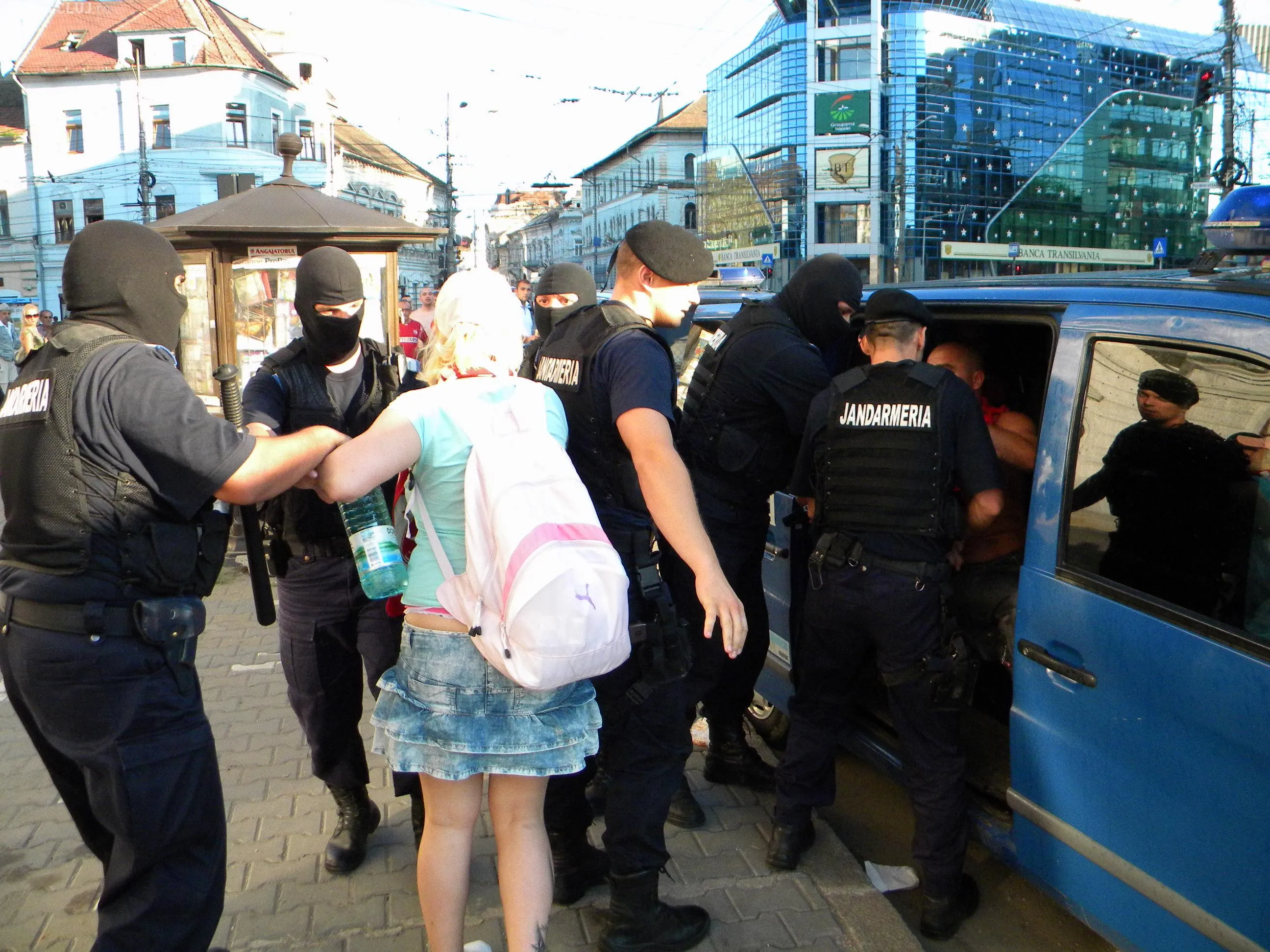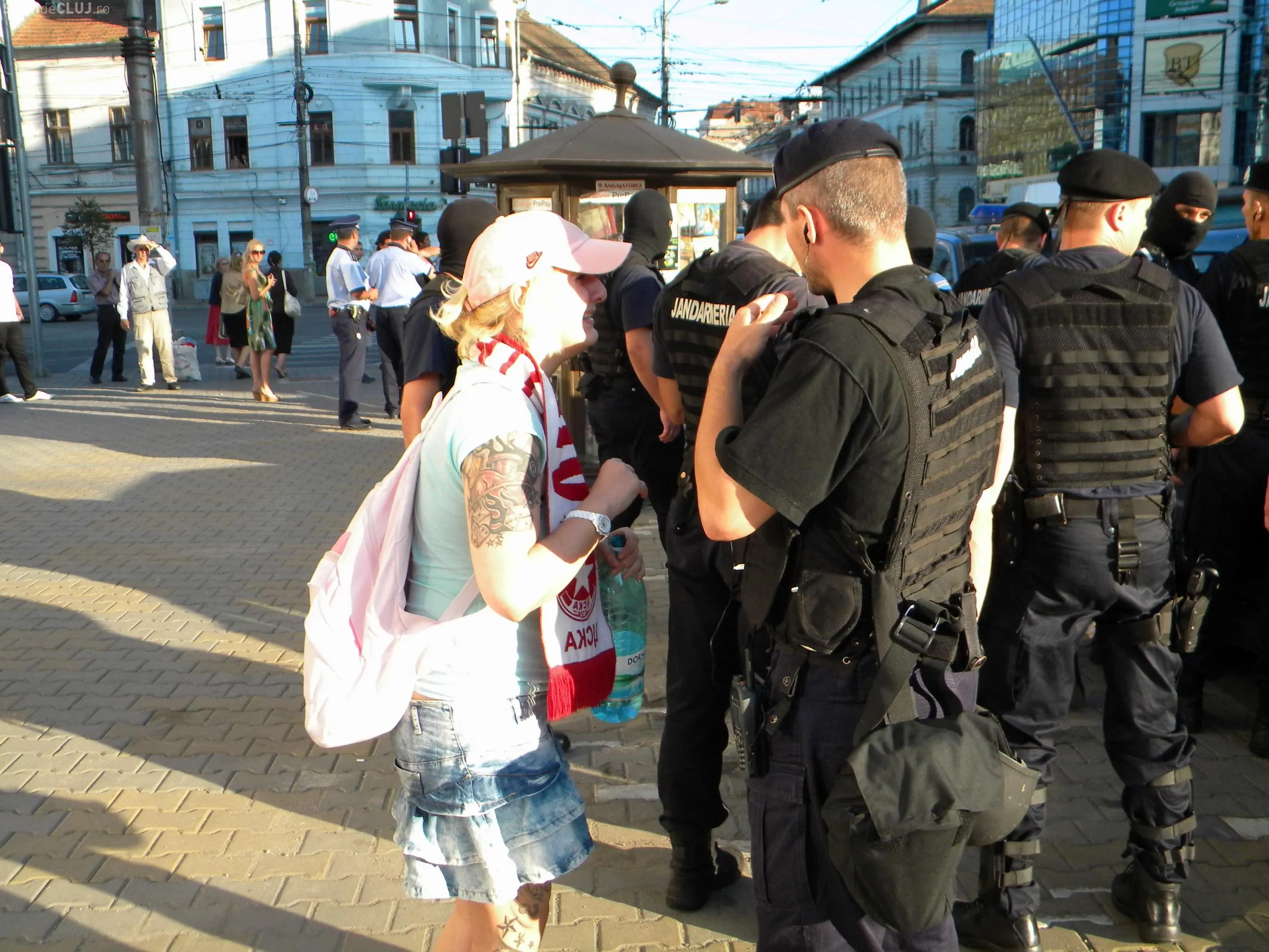 Unul dintre suporterii TSKA a iesit din grup si i-a administrat fetei un pumn, dar jandarmii au calmat rapid situatia, retinandu-l. Colegii acestuia i-au inconjurat, insa, pe jandarmi pentru a-si salva tovarasul si, cand suporterul a fost bagat in duba, acestia au inceput sa arunce cu sticle si cu doze de bere in masina. Unii dintre ei au dat si cu picioarele in caroserie.
