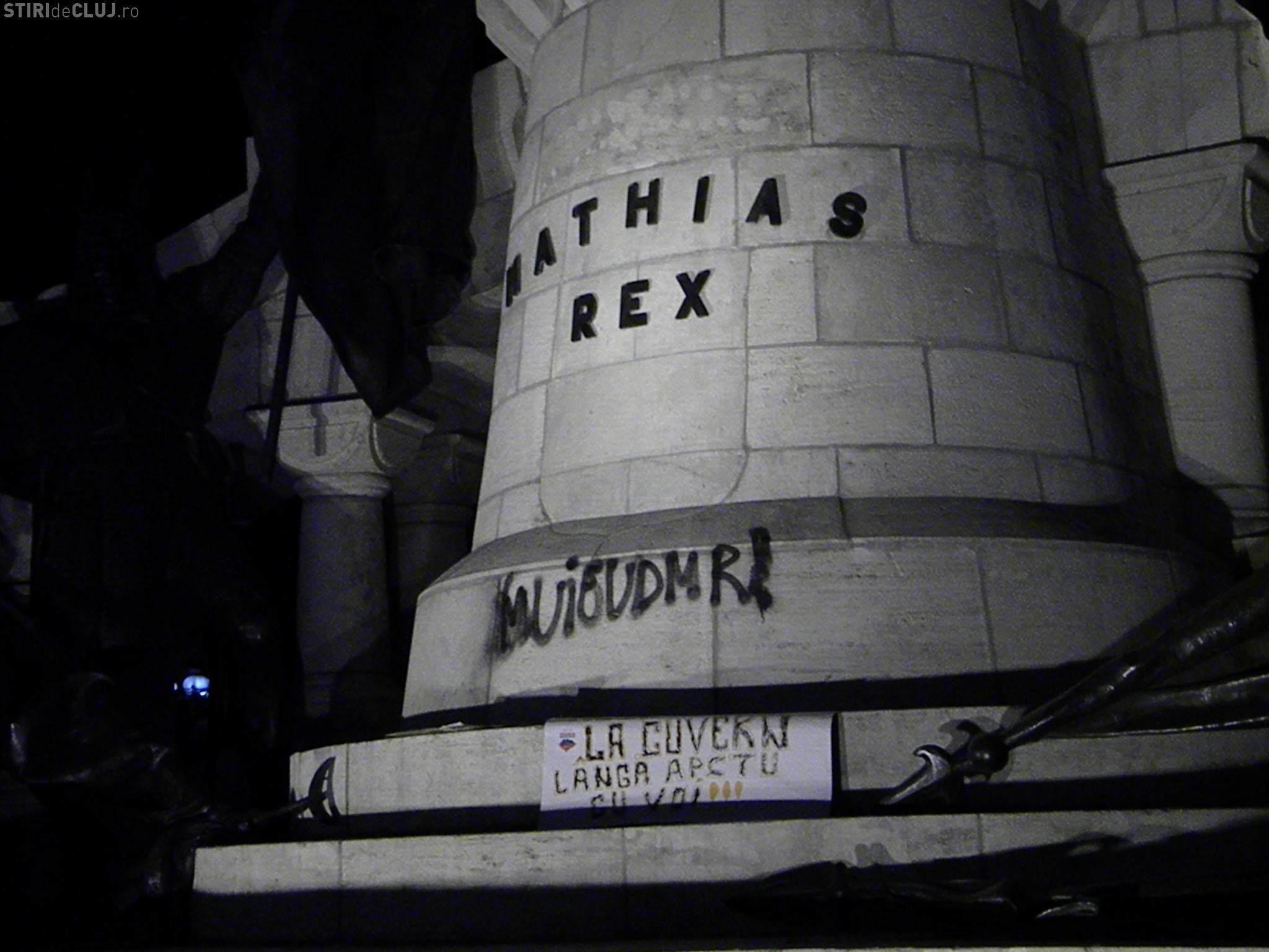 Suporterii U Cluj au scris "M..e UDMR" pe statuia lui Matei Corvin EXCLUSIV