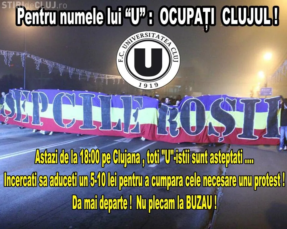”Astăzi de la ora 18.00 pe Clujana, toți U -iștii sunt așteptați... Încercați să aduceți un 5-10 lei pentru a cumpăra cele necesare unui protest! Dă mai departe! Nu plecăm la Buzău!”, se arată într-un afiș postat pe Facebook.