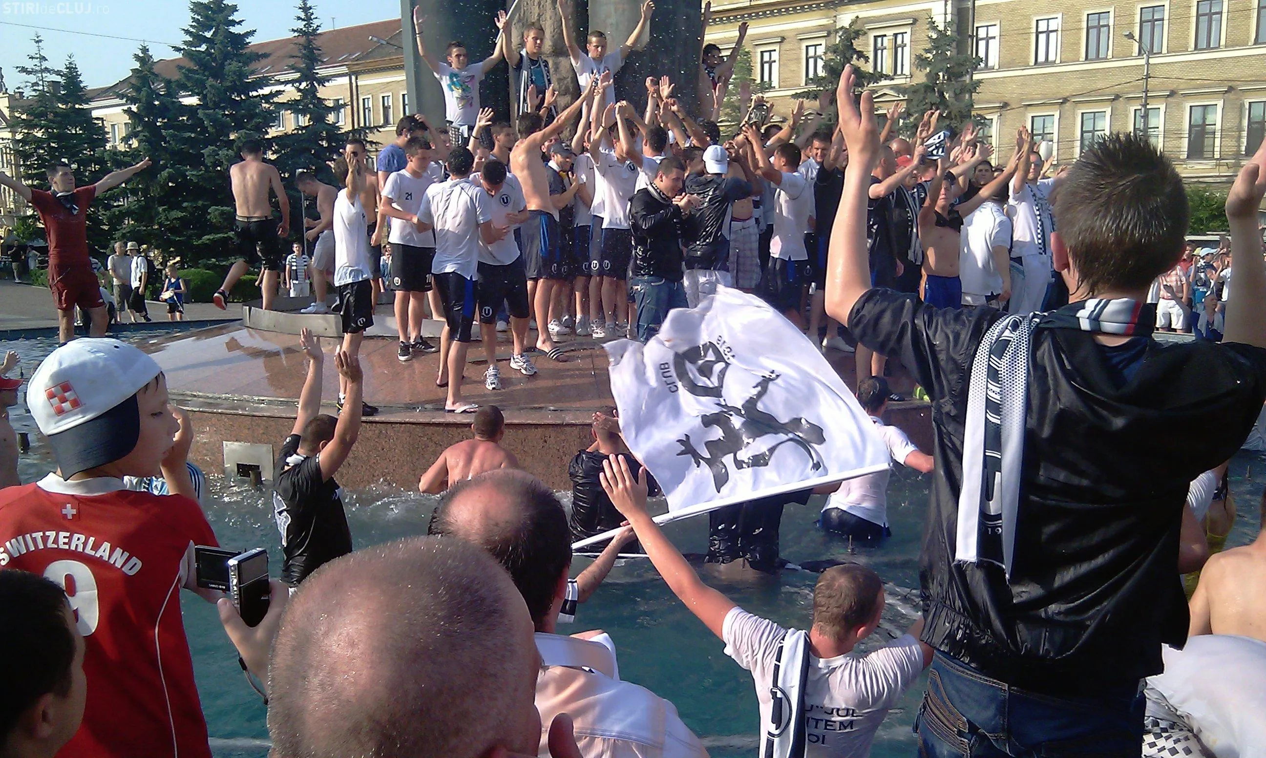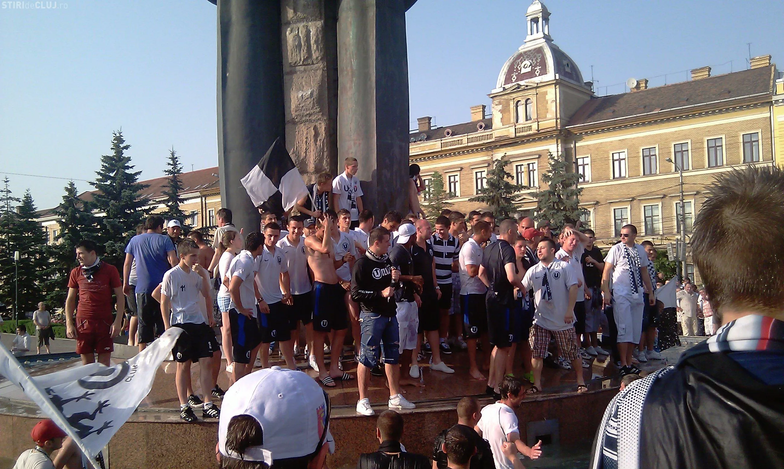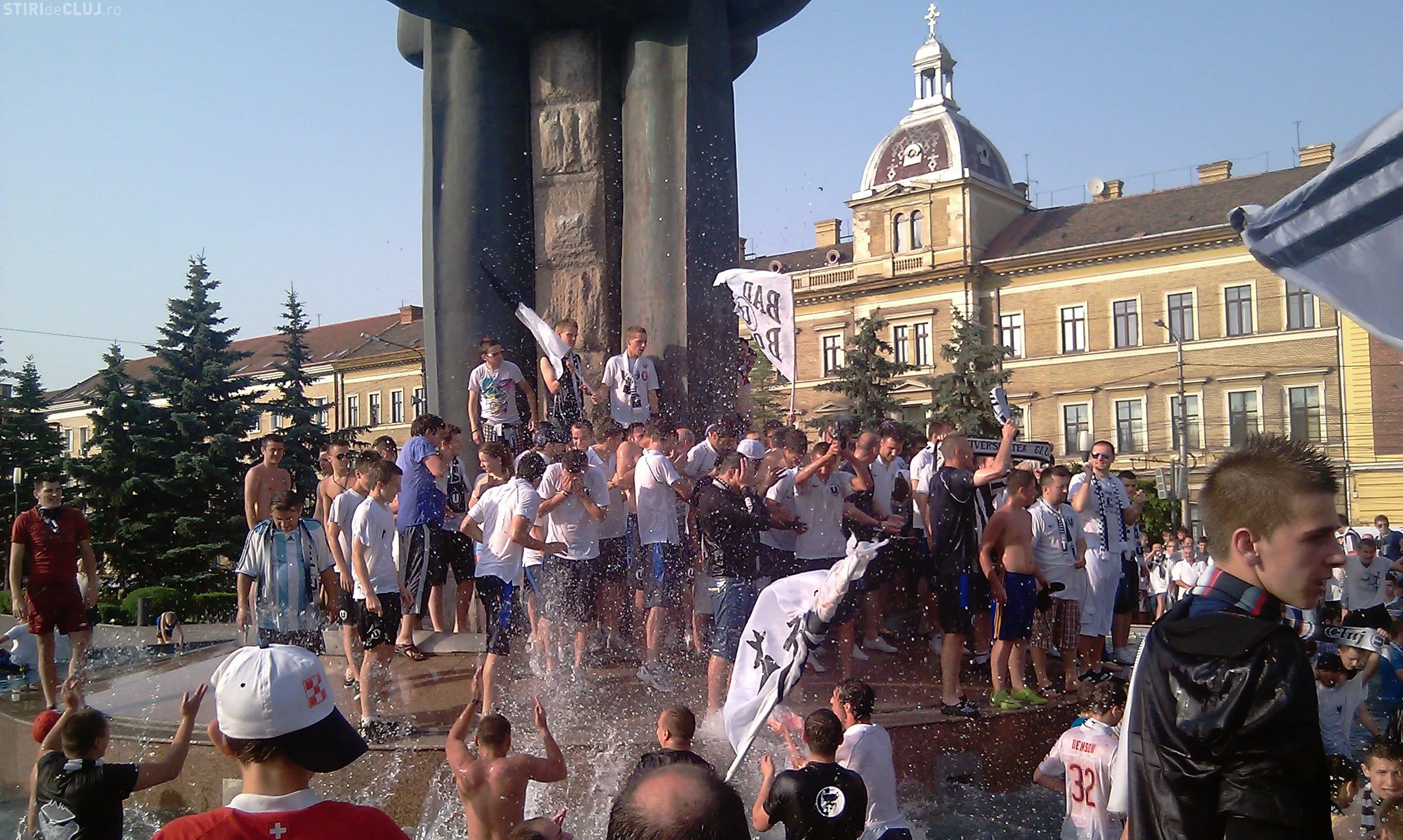 Suporterii care au sarbatorit sambata seara promovarea in Liga 1 a echipei Universitatea Cluj au stricat instalatia de iluminat a fantanii arteziene din Piata Avram Iancu.