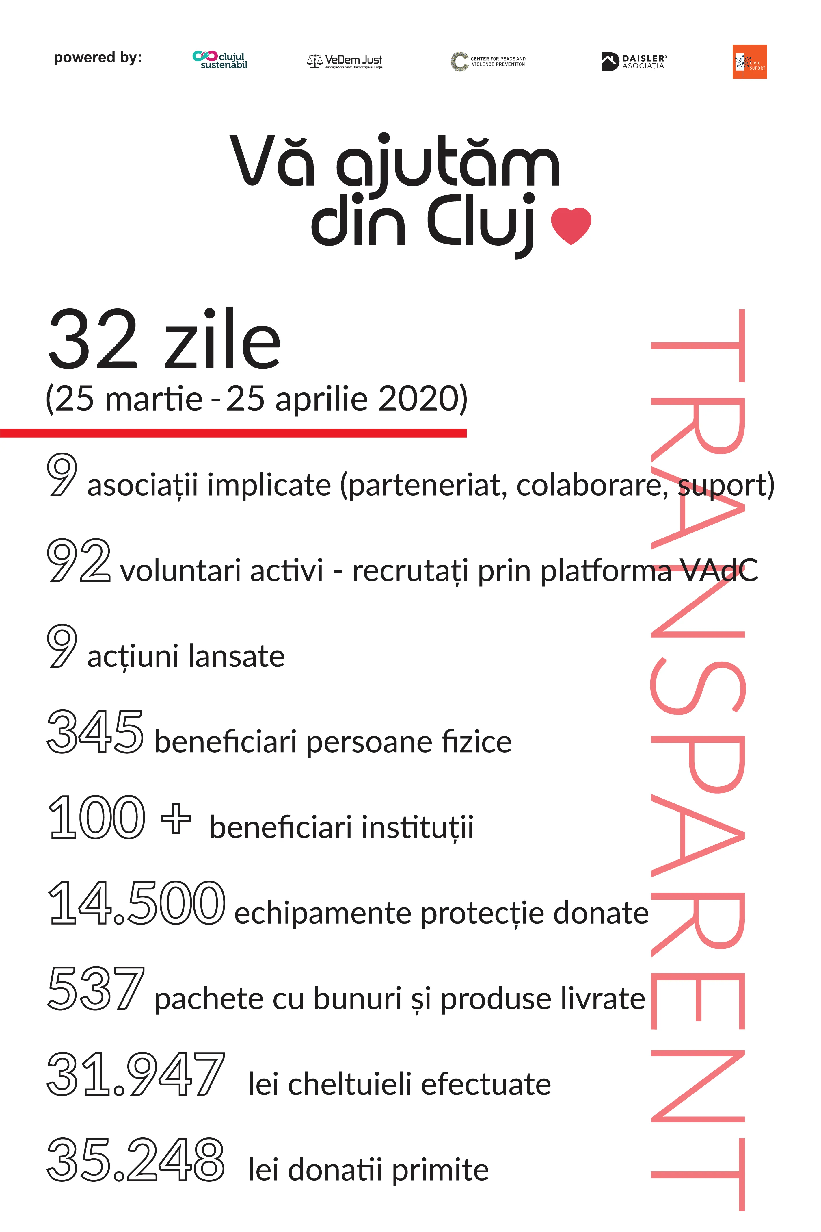 Platforma Vă Ajutăm din Cluj anunță că în primele 32 zile de la lansare, 92 de voluntari s-au alăturat inițiativei și au contribuit la distribuirea în condiții de risc minim de contaminare a 537 pachete cu alimente și medicamente către 345 beneficiari persoane fizice. De asemenea, personalul din mai mult de 100 de instituții a fost sprijinit prin donarea a 14.500 de echipamente de protecție. Până la data de 25 aprilie s-au cheltuit 31.947 lei din donațiile primite (35.248 lei) în cadrul celor 9 acțiuni întreprinse.