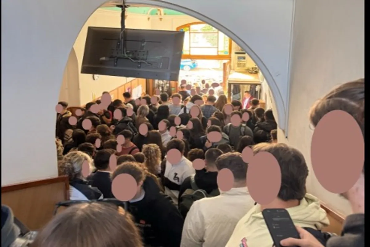 Sute de studenți, împreună cu câțiva profesori, rămân blocați din cauza porții, holului și scărilor mult prea înguste pentru un așa trafic infernal.