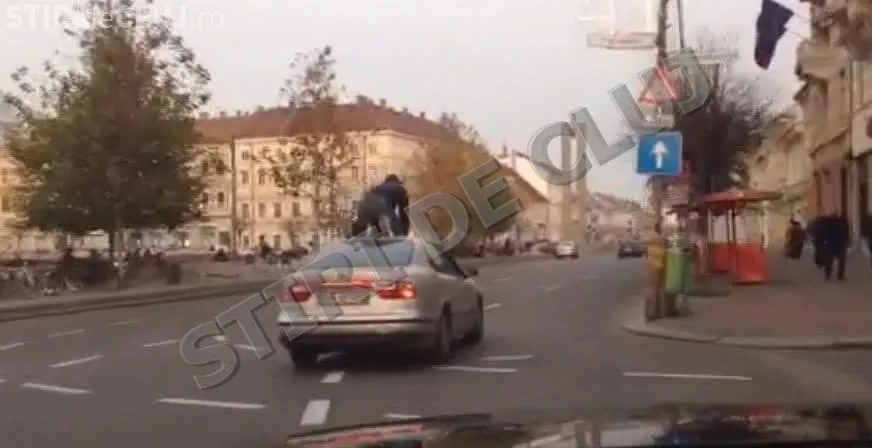 Bărbatul stătea în patru labe pe capota unui autoturism și se ținea cu mâinile de trapa de aerisire. Imaginile au fost surprinse pe strada Napoca, dar mașina și-a continuat drumul spre Bulevardul Eroilor.