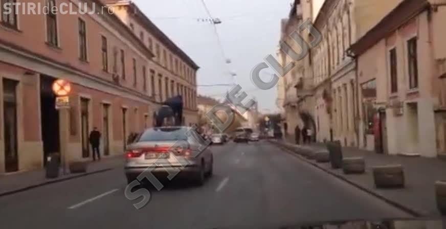 Tânăr CĂLARE pe capota unei mașini prin centrul Clujului! Imagini INCREDIBILE - VIDEO