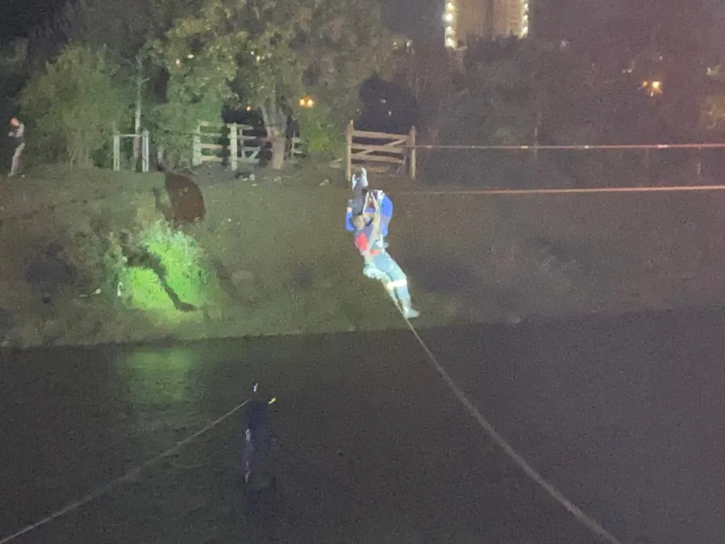 Un pompier, asigurat cu un ham și cordiță de salvare, s-a deplasat pe cablu până la tânăr pentru al readuce la mal, iar echipa de scafandri a intrat în apă pentru a fi pregătiți să-l salveze în cazul în care acesta cădea de pe cablu.